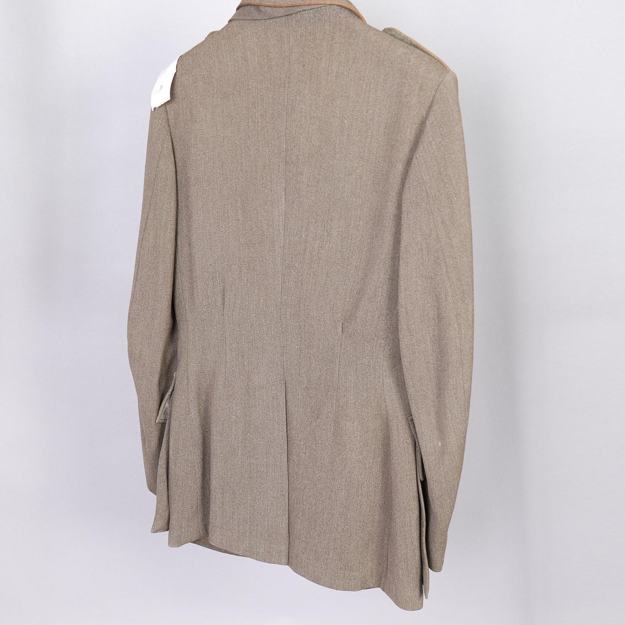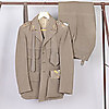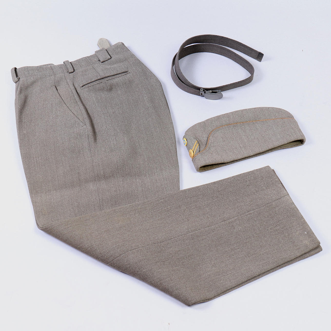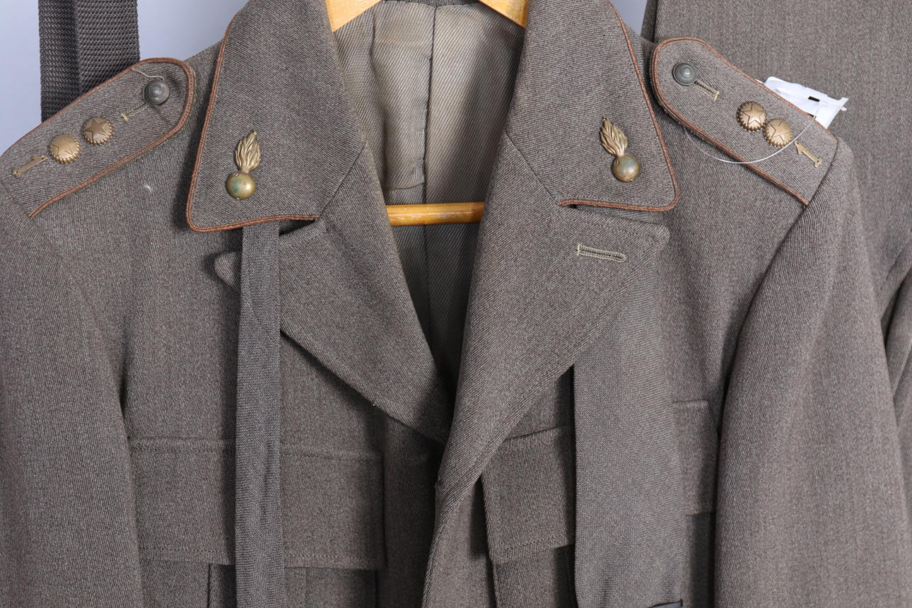 Kavaj, byxor, slips, mössa, skärp. Gradbeteckning för fanjunkare. Truppslagstecken för artilleriet.