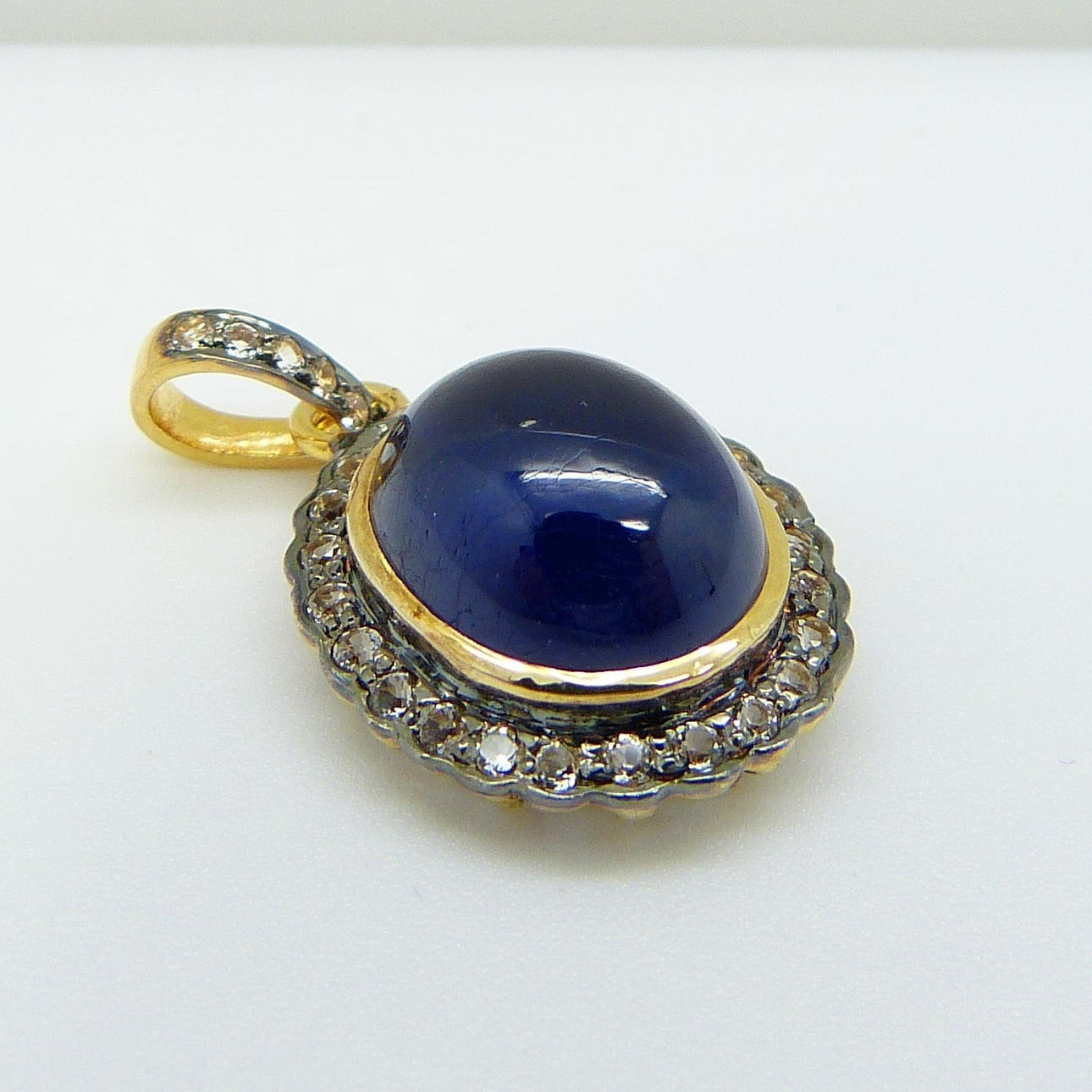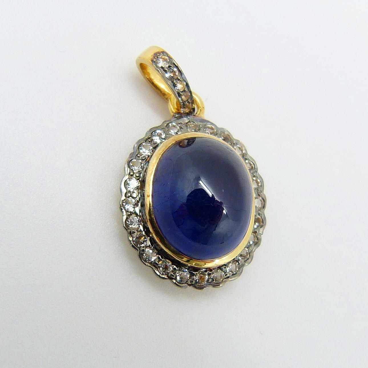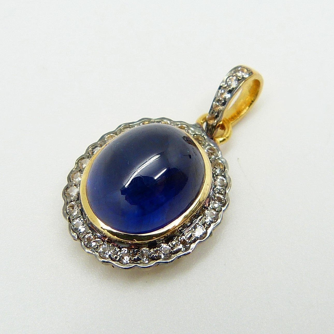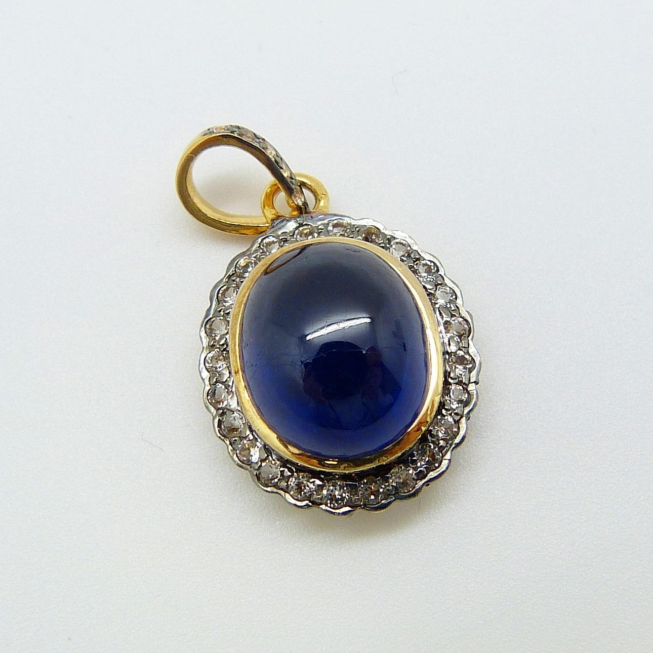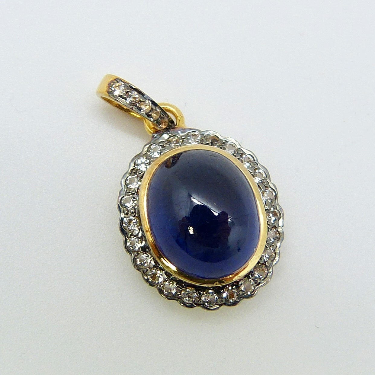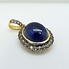 Hänge i vintagestil, guld och silver med en stor, behandlad cabochonslipad blå safir och små, rundslipade vita safirer.