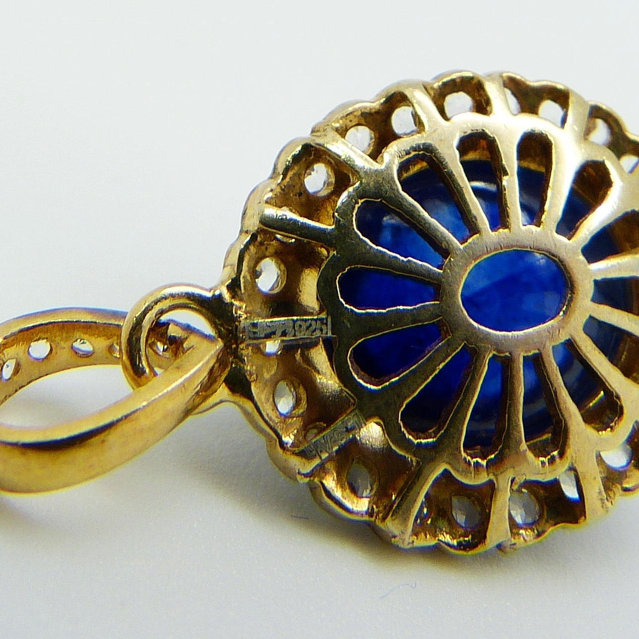 Baksidan av detta hänge är dekorerad i ett filigranmönster.