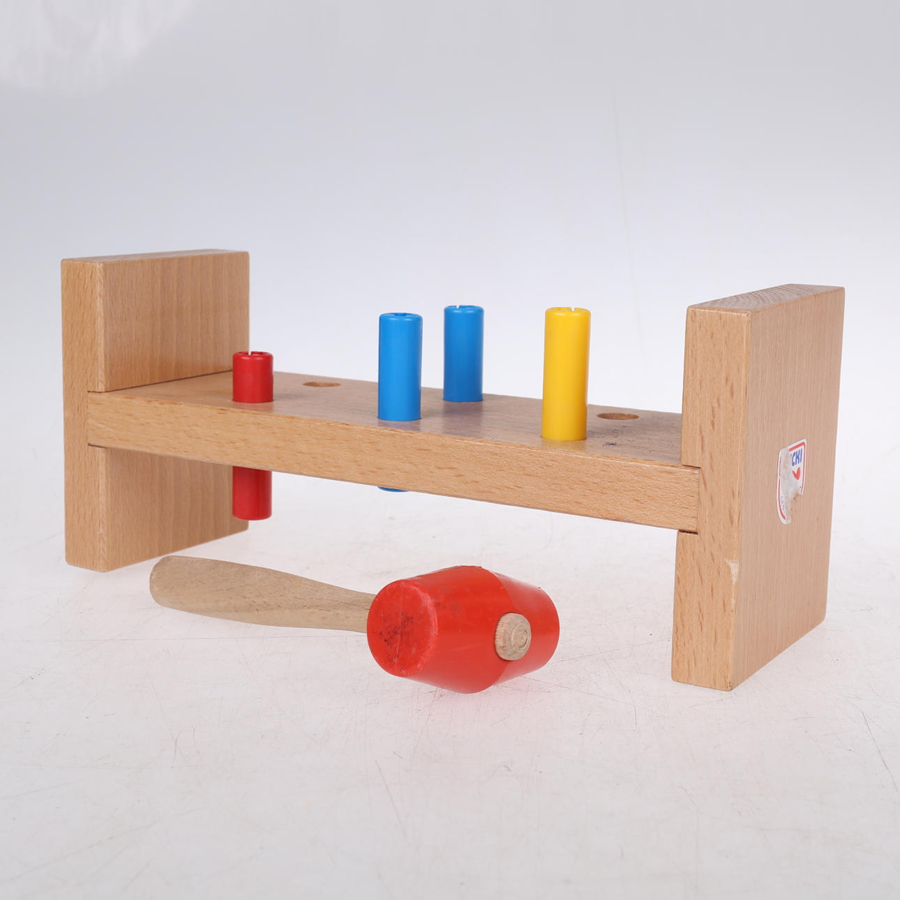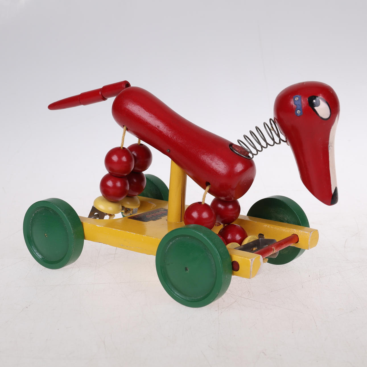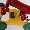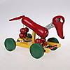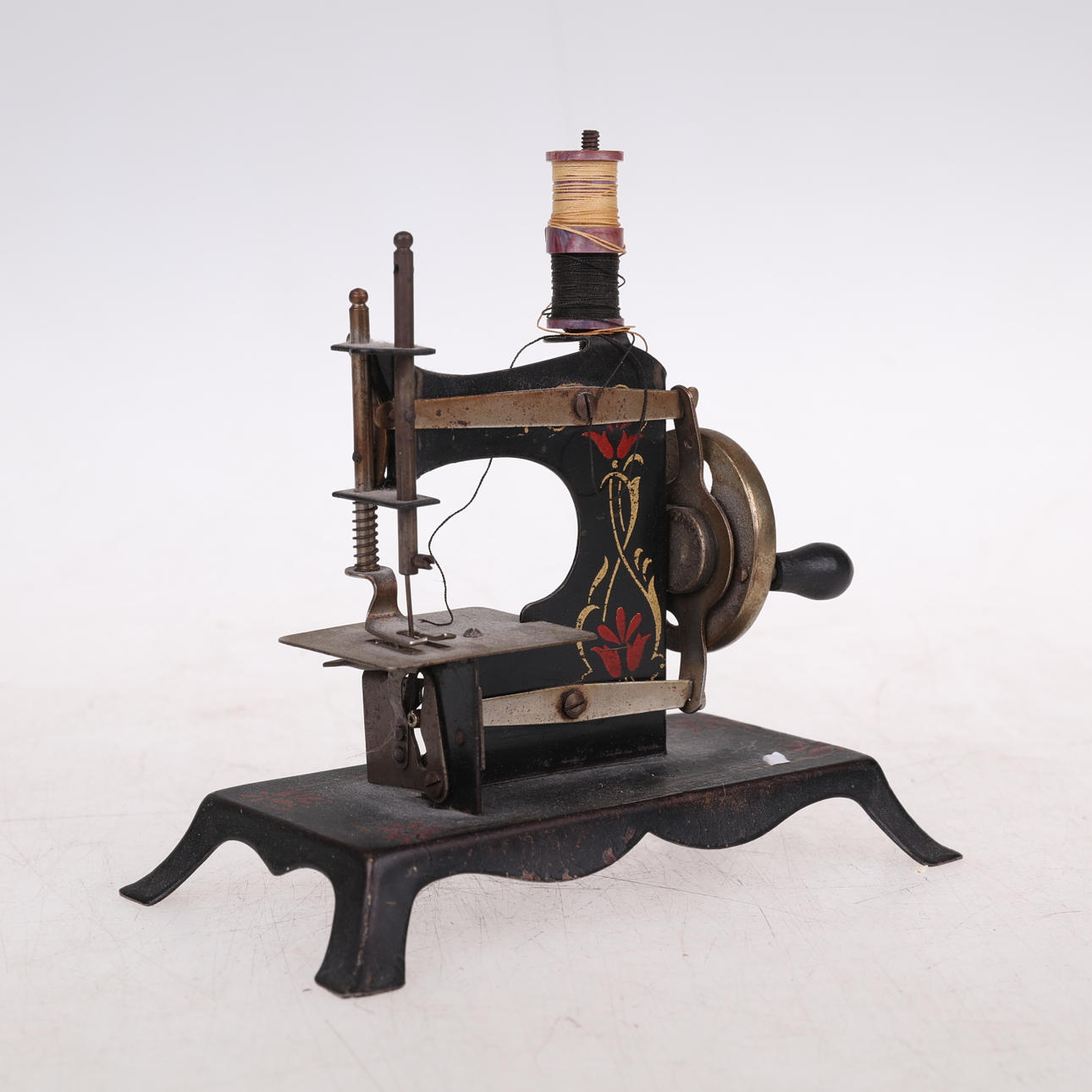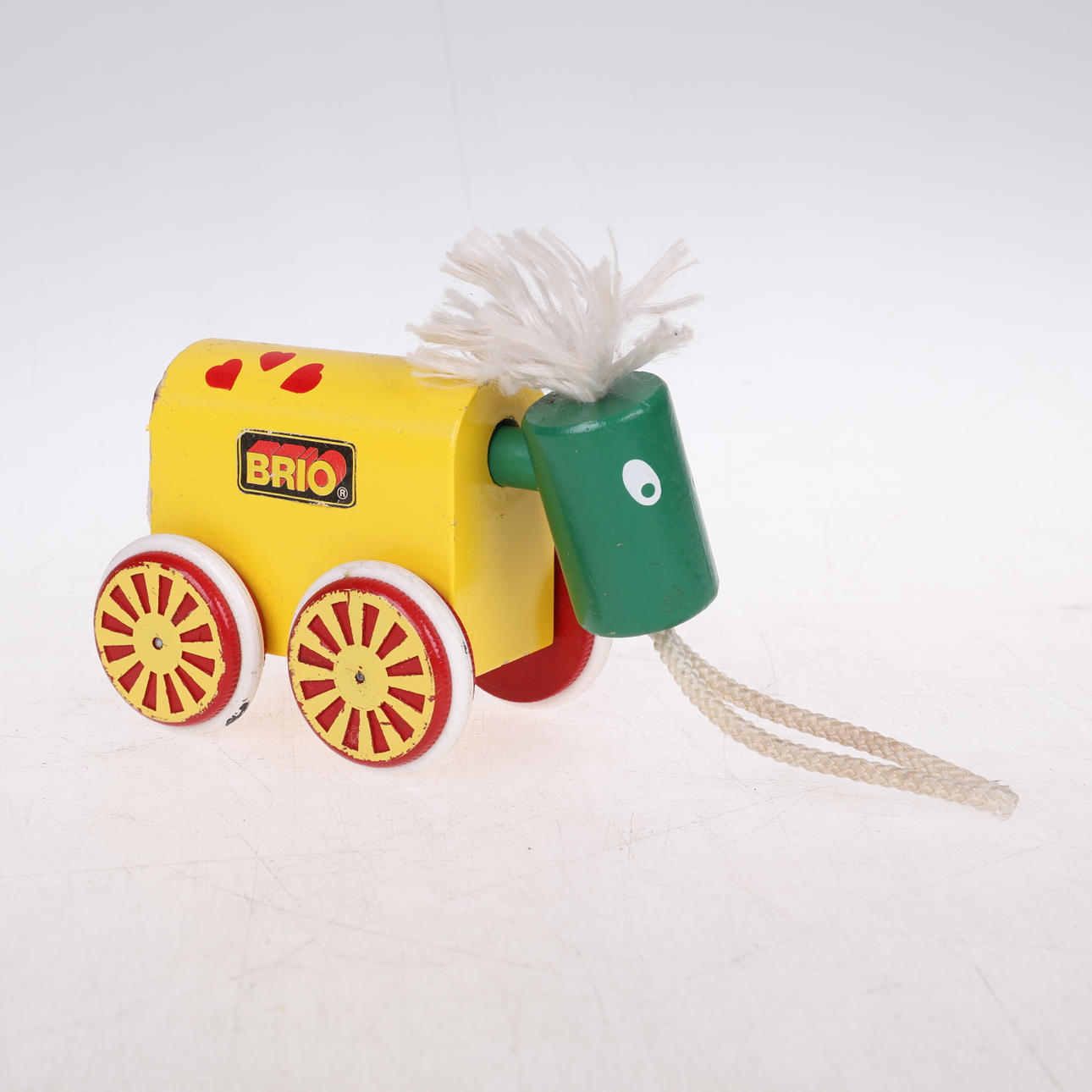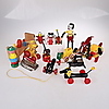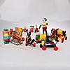 En samling Brio leksaker 12 stycken samt 3 andra objekt: Symaskin "FOREIGI" 12 cm lång, 12 cm hög, Strykjärn: "RAUCO" med platta 13 cm lång, 9 cm hög, Barnleksak med gummiklubba.