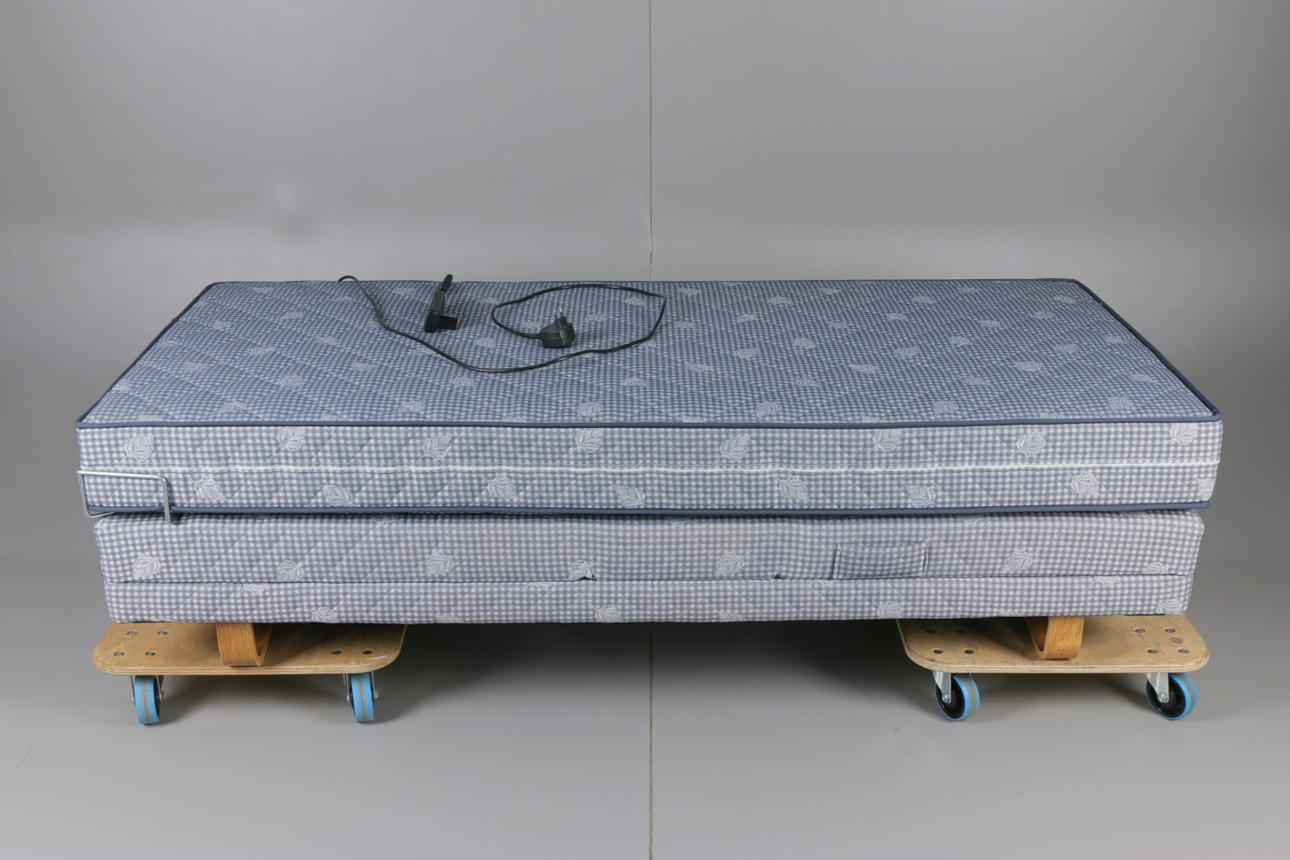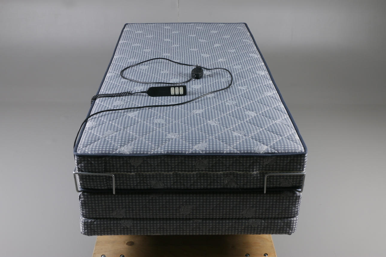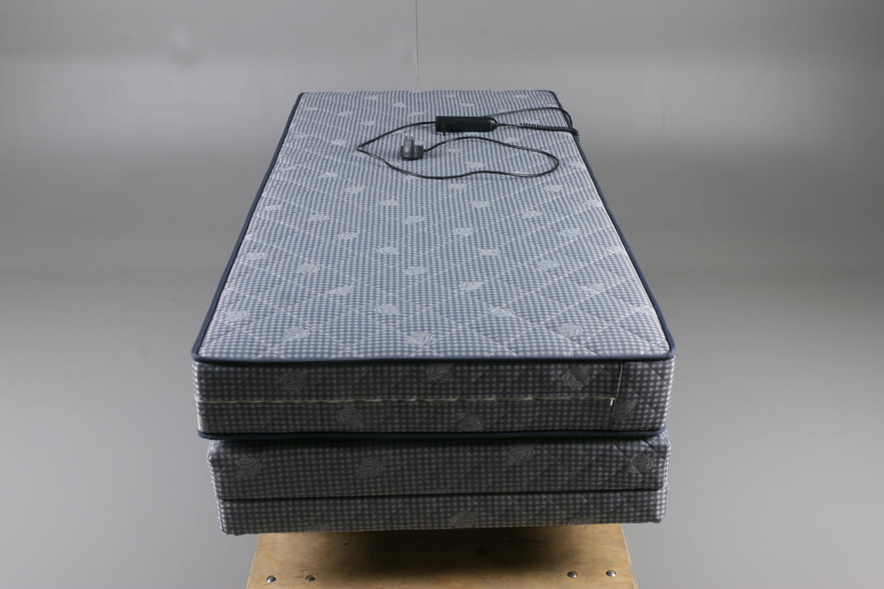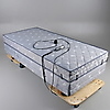 Säng ställbar i höjdled samt reglerbar huvudgärd och fotgärd. Vändbar madrass, tjocklek18 cm Mått 91 x 201 cm.