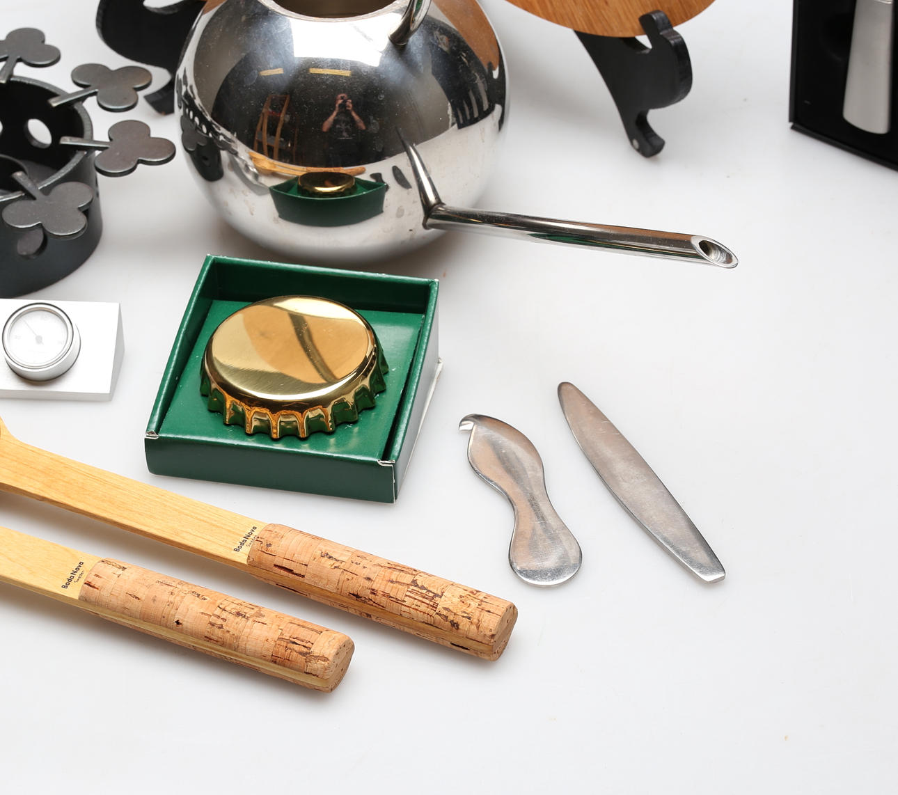 Bland annat kanna, WMF. Kapsylöppnare, Georg Jensen. Ostset, Raadvad.