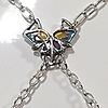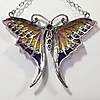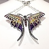Fjärilen hänger längst ner på halsbandet som ett hänge. Vingarna är inläggningar med emalj i färgerna lila, gult och rosa.