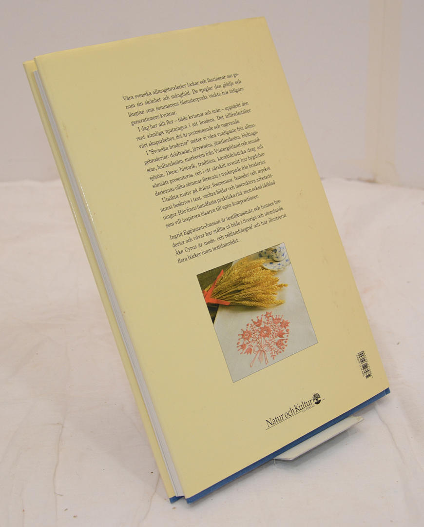 "Här beskrivs både våra vanligaste landskapssömmar och nyskapande broderier inspirerande av svenska allmogesömmar. De presenteras med historik, beskrivning och arbetsritning. Sverige har en lång tradition när det gäller landskapssömmar. Här presenteras de vanligaste; Delsbosöm, Järvsösöm, Jämtlandssöm, Hallandssöm, Marbosöm och Anundsjösöm och även nyskapande broderier inspirerade av svenska allmogesömmar. Festremsor, julgirlander, dukar, bonader, barnmössor och mycket annat presenteras med historik, beskrivning, arbetsritning (skala 1:1) och idéblad. Vackra och inspirerande färgfotografier illustrerar de utsökta broderierna. Även brodering av monogram tas upp och hur man tvättar och förvarar broderier. Ingrid Eggimann-Jonsson är verksam som textilkonstnär och hennes broderier och vävar har ställts ut både i Sverige och utomlands. Hon är utbildad på Konstfack.