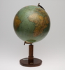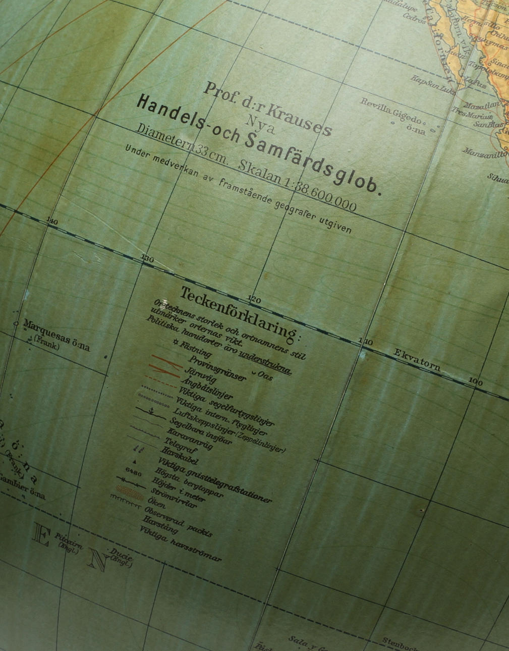 Infälld kompass i träfoten. Globen märkt "Prof. d:r Krauses Nya Handels och Samfärdsglob". Höjd 55 cm.