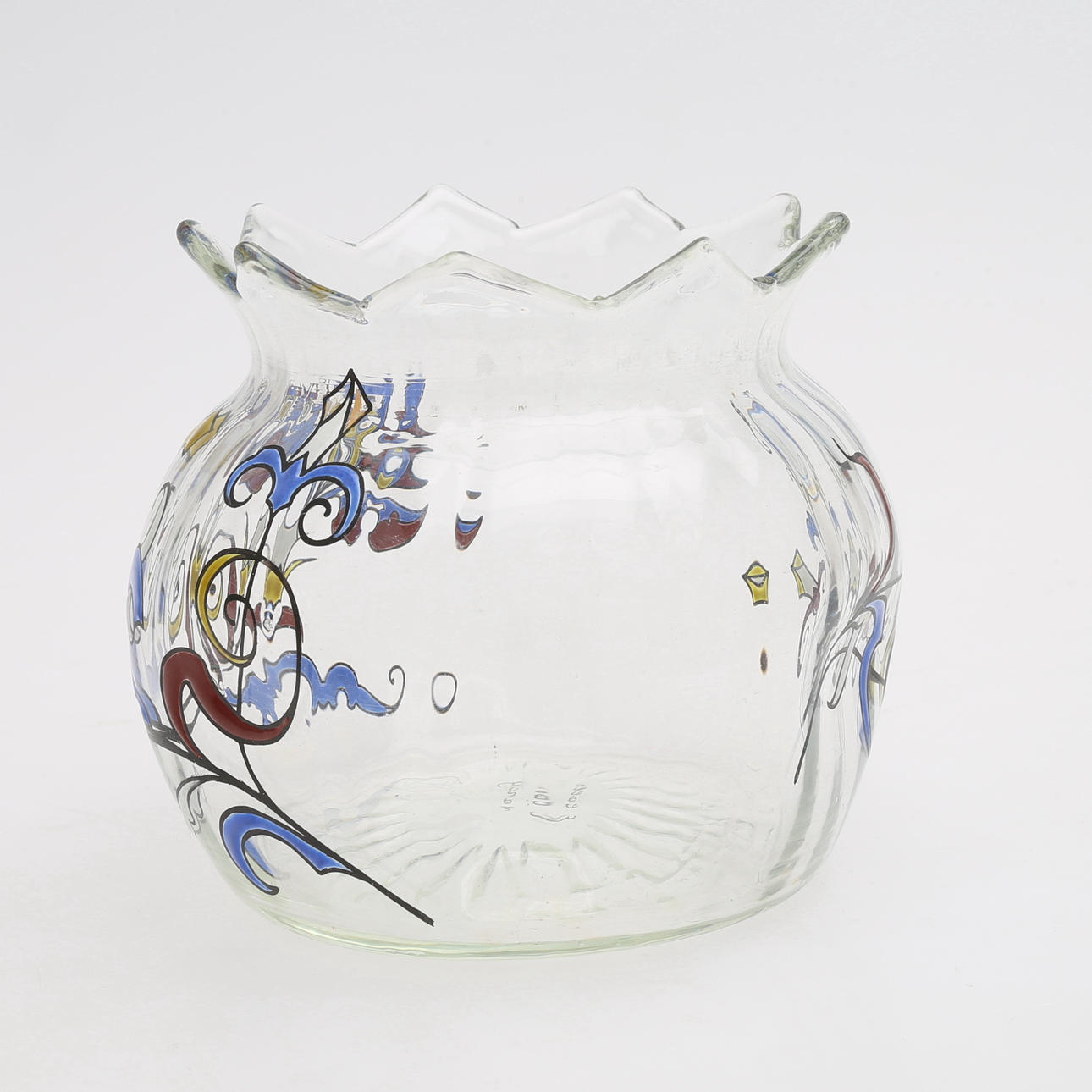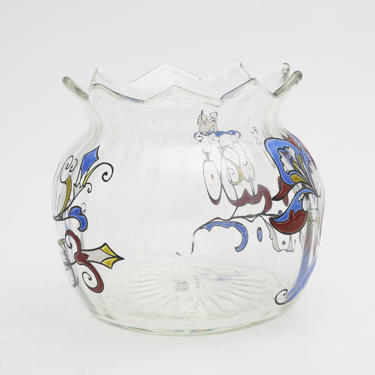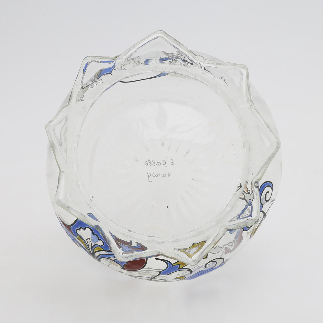 Art Nouveau, klarglas med polykrom emaljdekor, signerad "E. Gallé Nancy", höjd 11, diameter 12 cm.