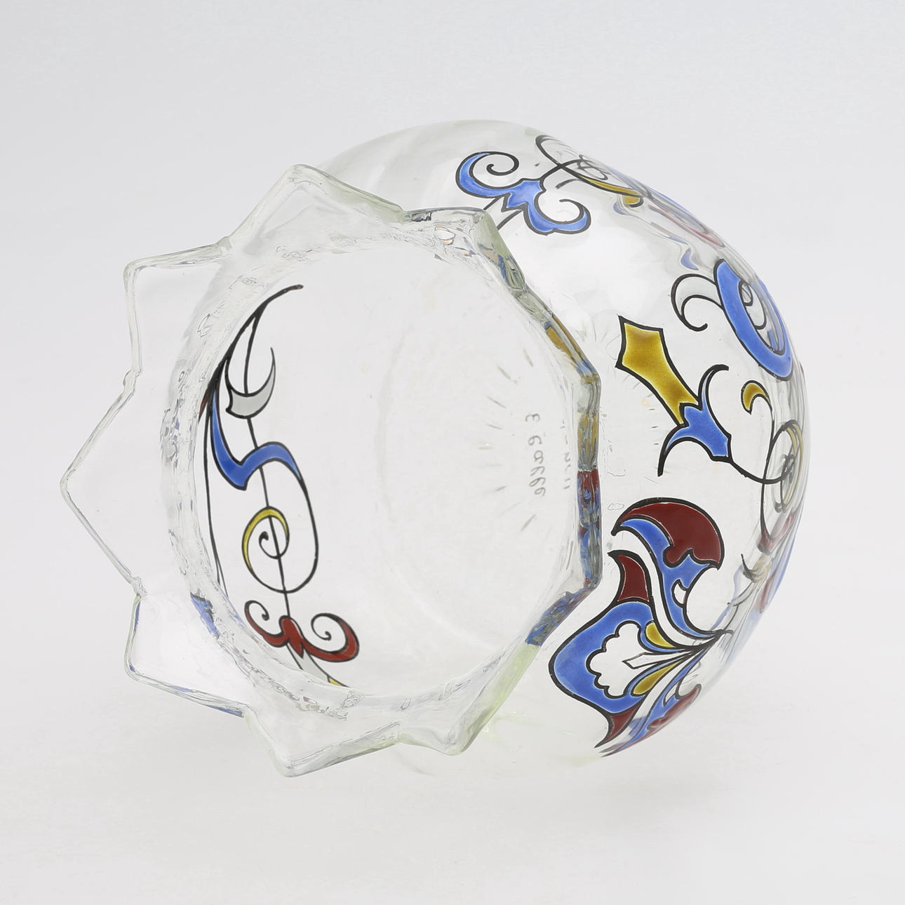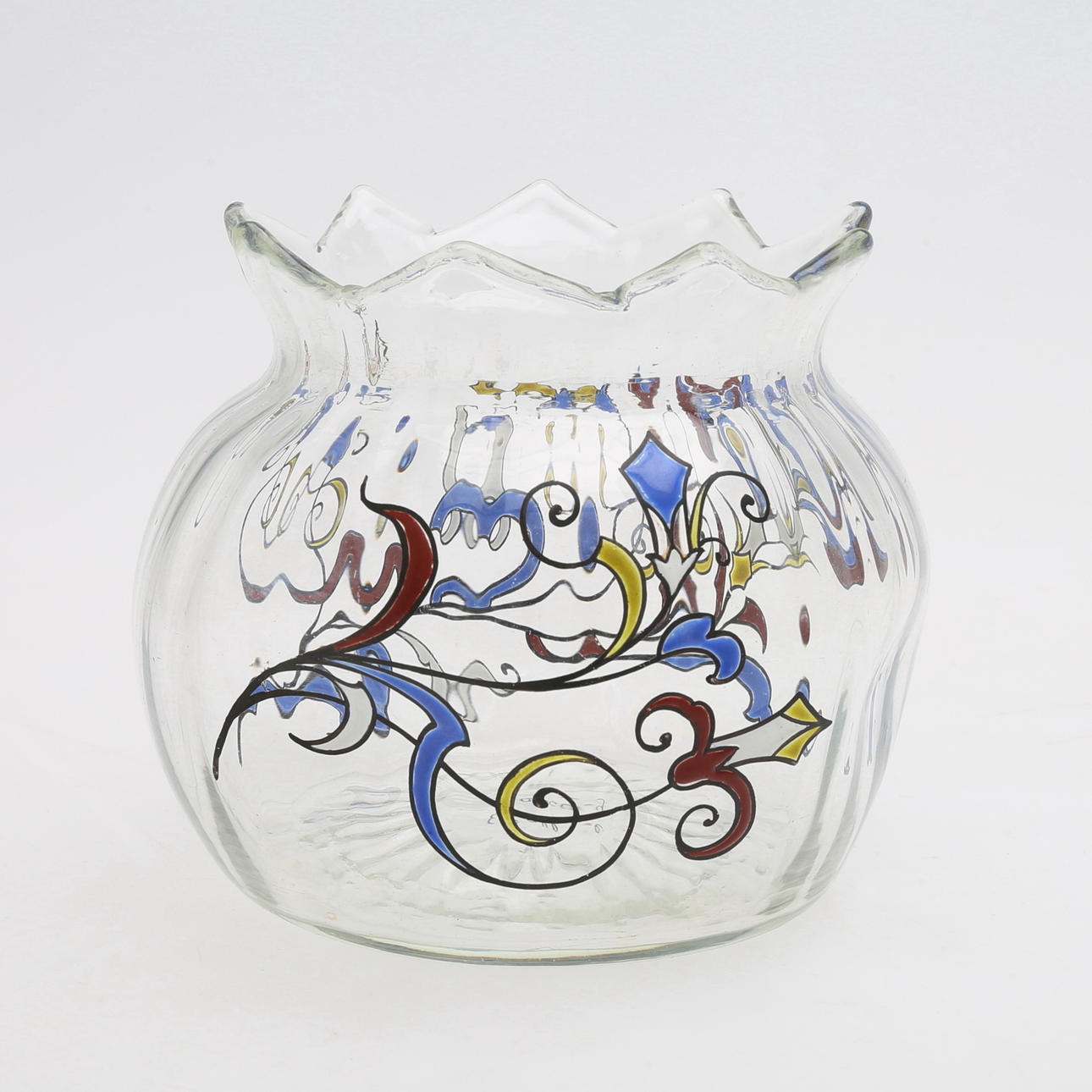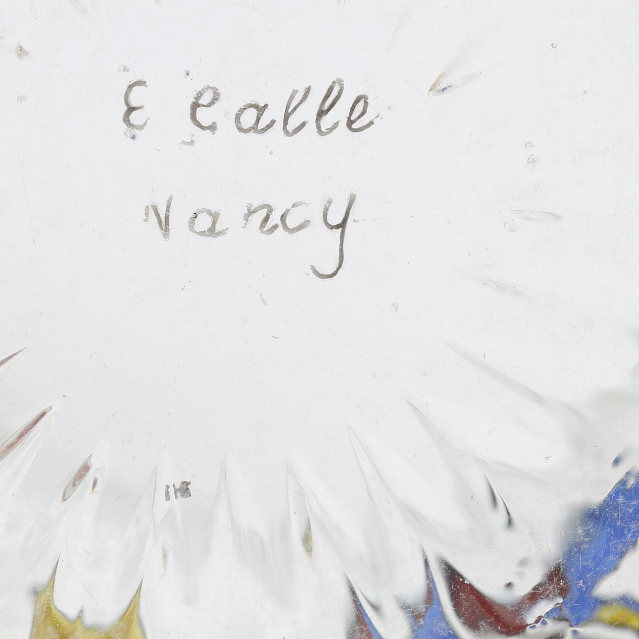 Art Nouveau, klarglas med polykrom emaljdekor, signerad "E. Gallé Nancy", höjd 11, diameter 12 cm.