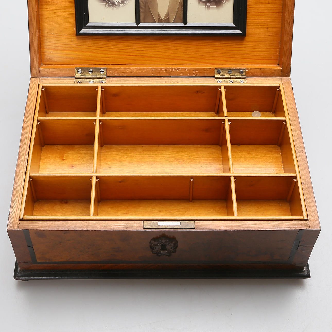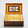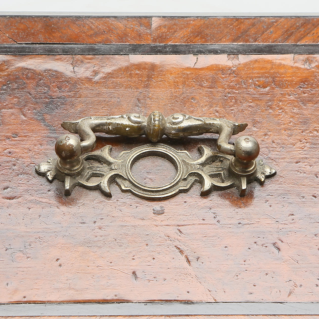 Ålders samt bruksslitage. Något vingligt. Fanérskador, märken, delar saknas. -Nyckel saknas. Lås ej genomgånget. Glas med skada.