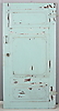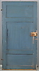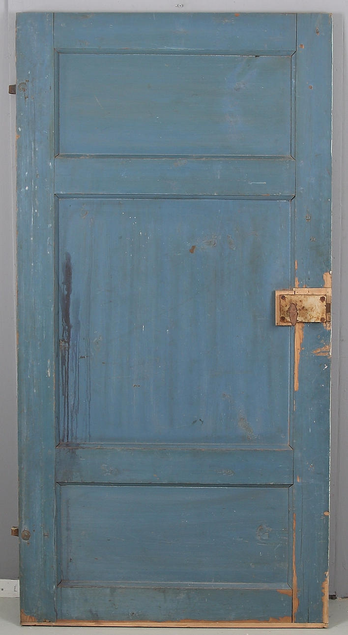 En sida med tre utanpåliggande fyllningar med utskurna hörn, en sida med tre infällda fyllningar. Smidda beslag. Mått ca. 164 x 83,5 cm.