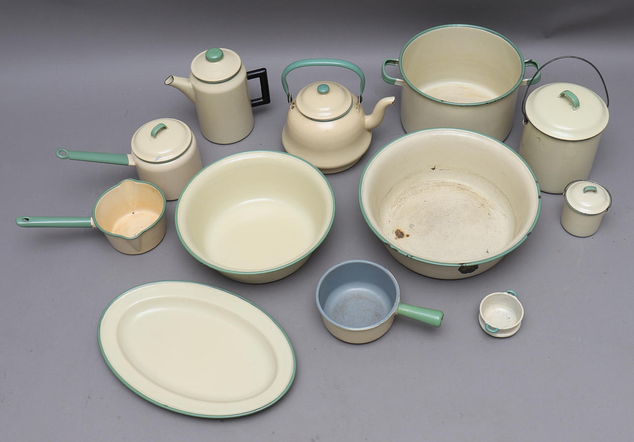 Två baljor, ett ovalt fat, fyra grytor, tre burkar med lock och två kannor.