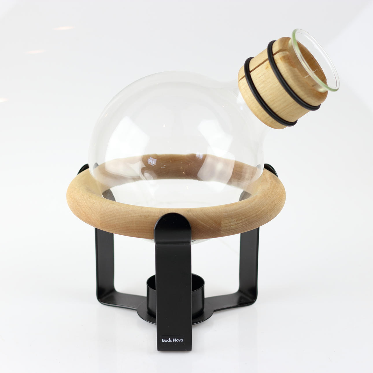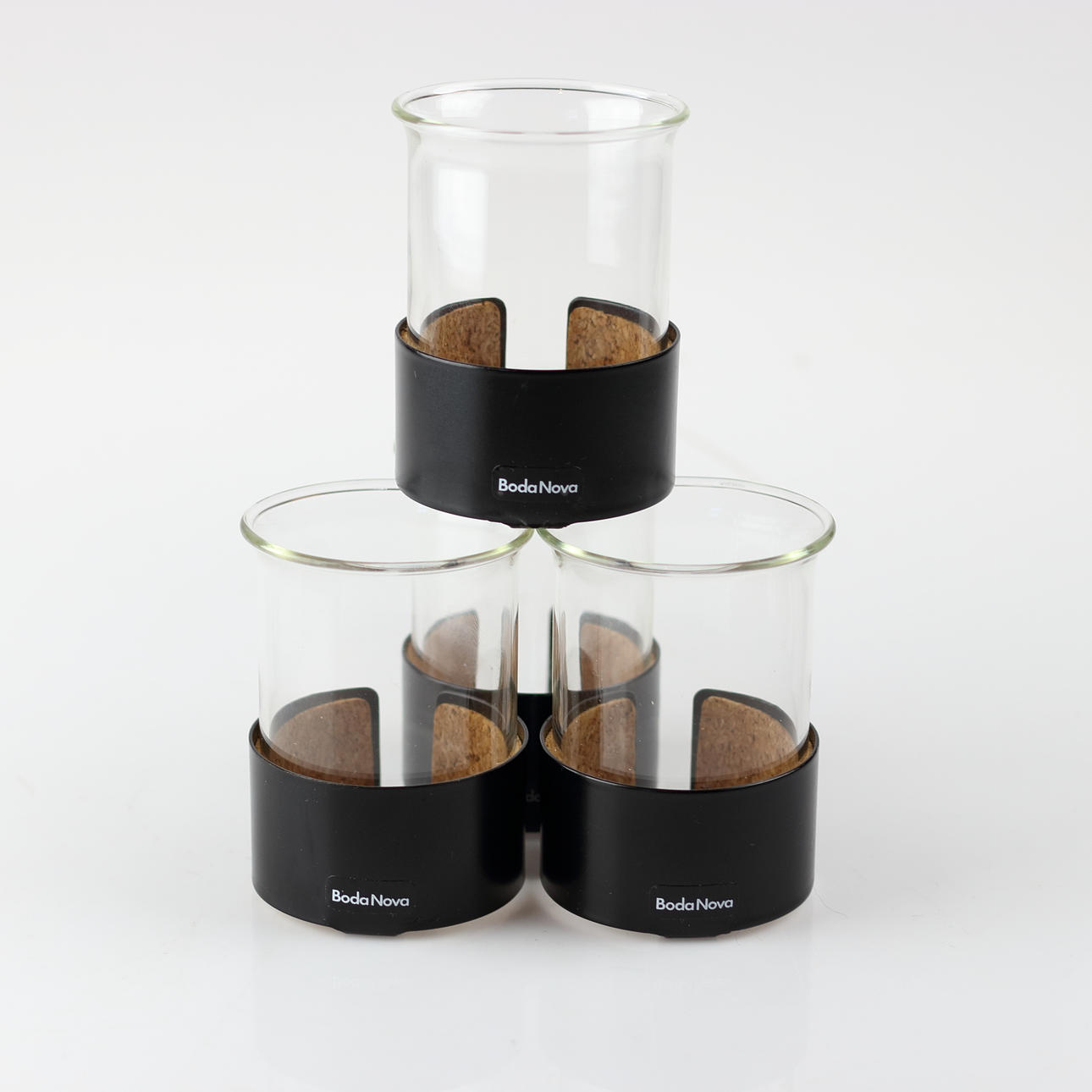 Glaskolv med stativ för värmeljus, 4 muggar och 4 skedar.
