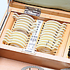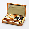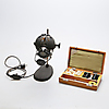 Låda med glaslinser+glasögon samt instrument för oftalmoskopering. Instrument, höjd ca 33 cm.