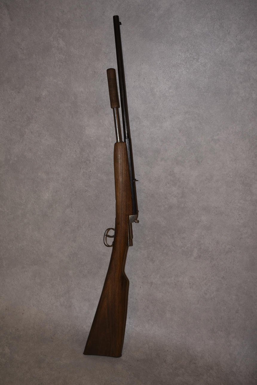 Luftgevär pump, rak engelsk kolv, oktagonalt kammarstycke. Tidig modell.