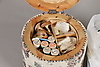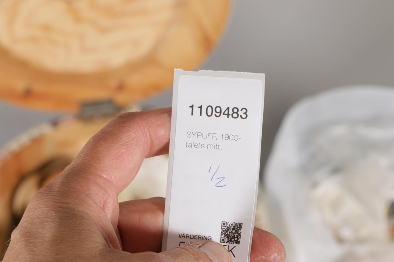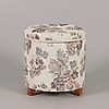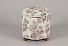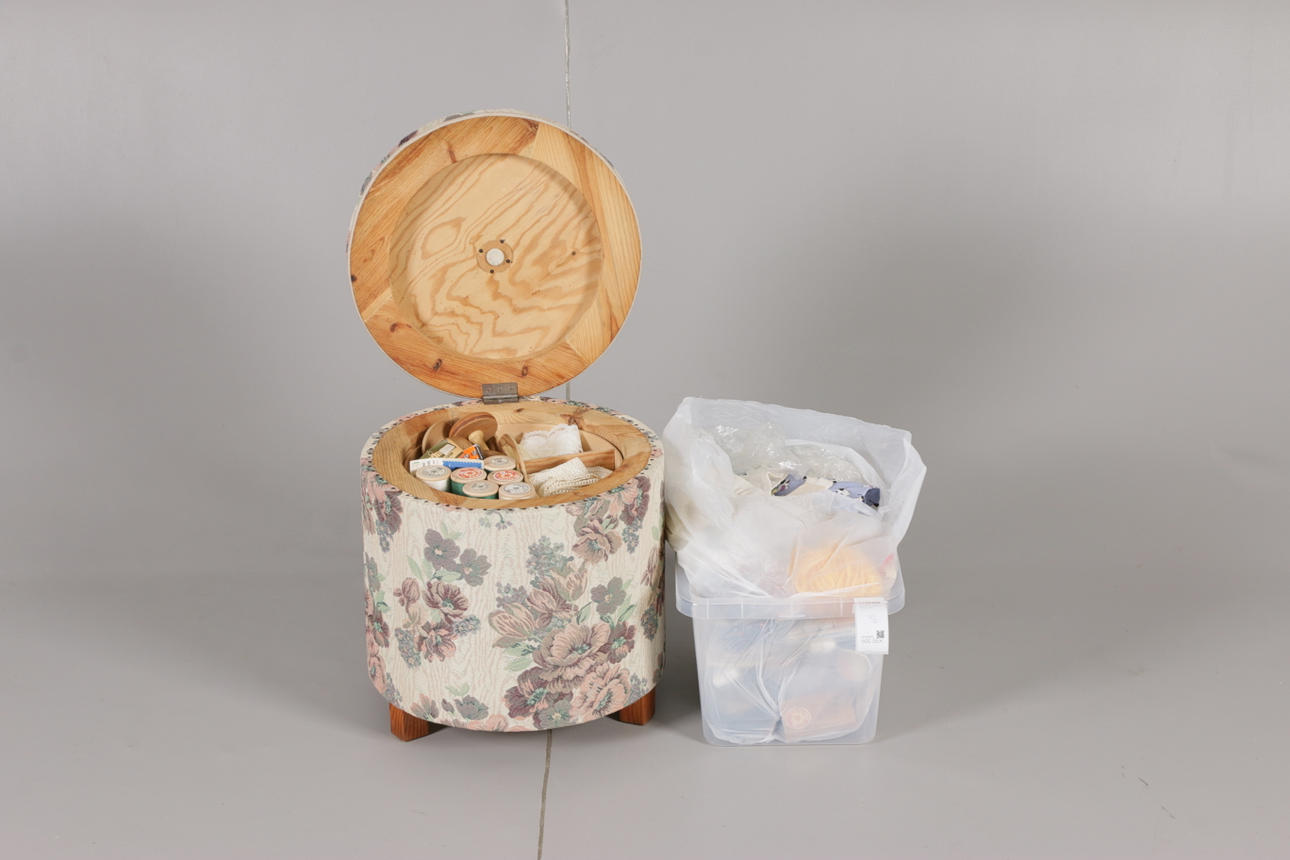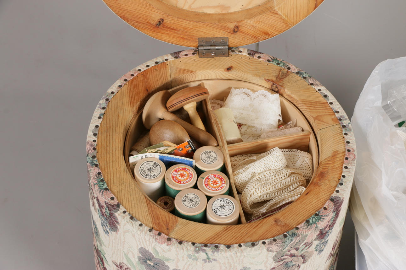 Textilklädd sypuff med lock och löstagbar fackinreding för sybehör samt underliggande förvaringsyta.