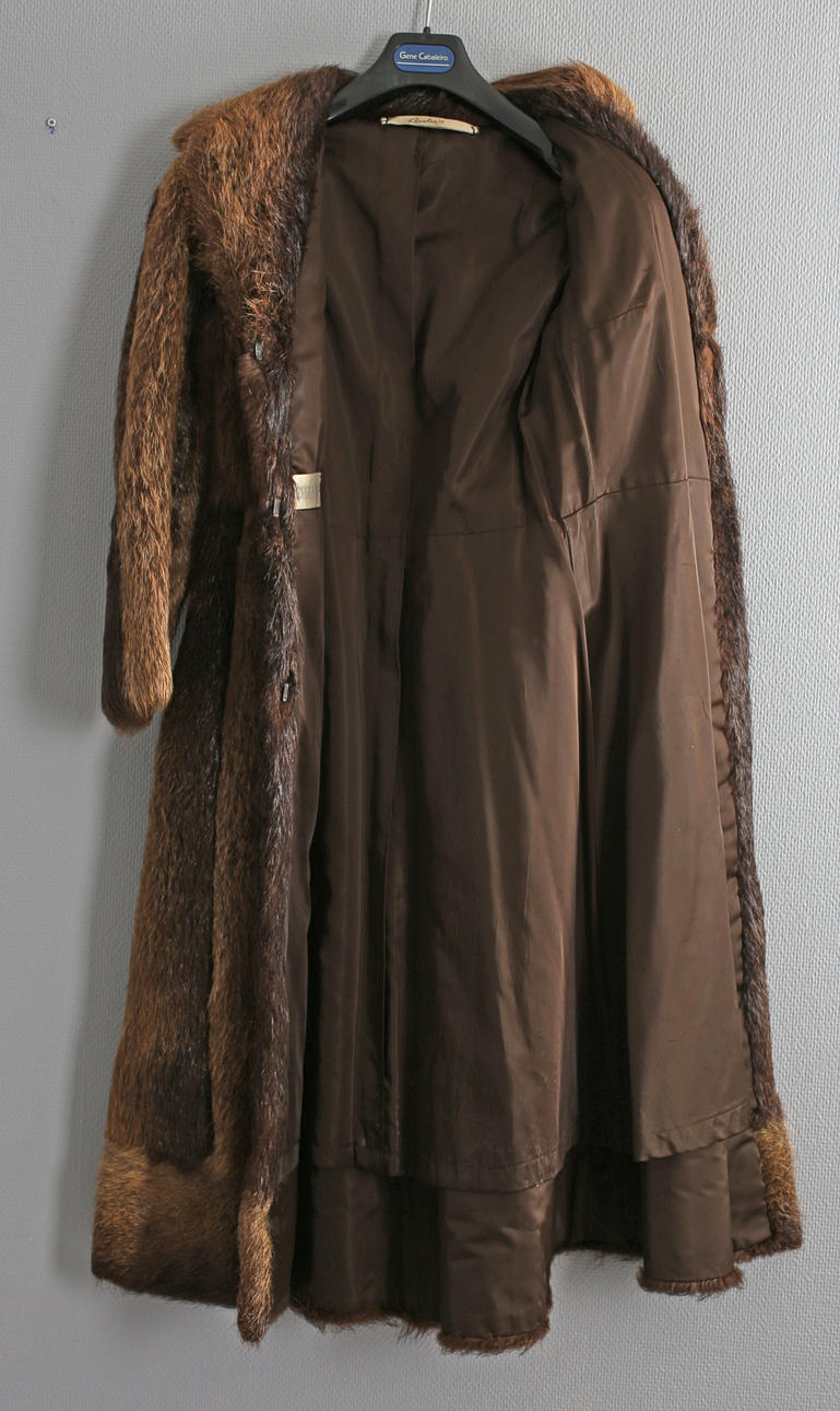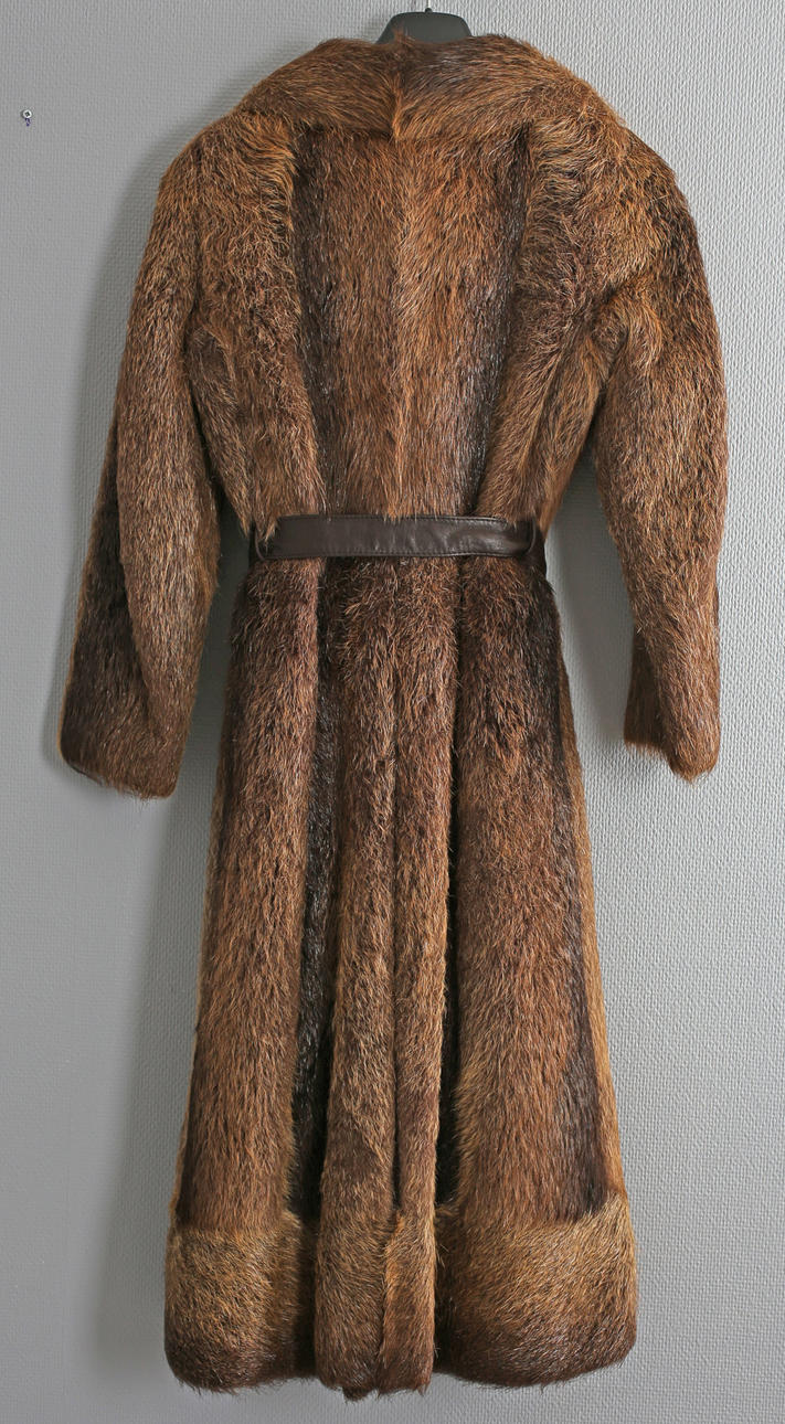 Enligt uppgift Nutriapäls dvs Sumpbäver. Lätt a-linje formad modell. Invändigt helfodrad. I sidan dolda fickor. Med skärp. Längd ca 115 cm.