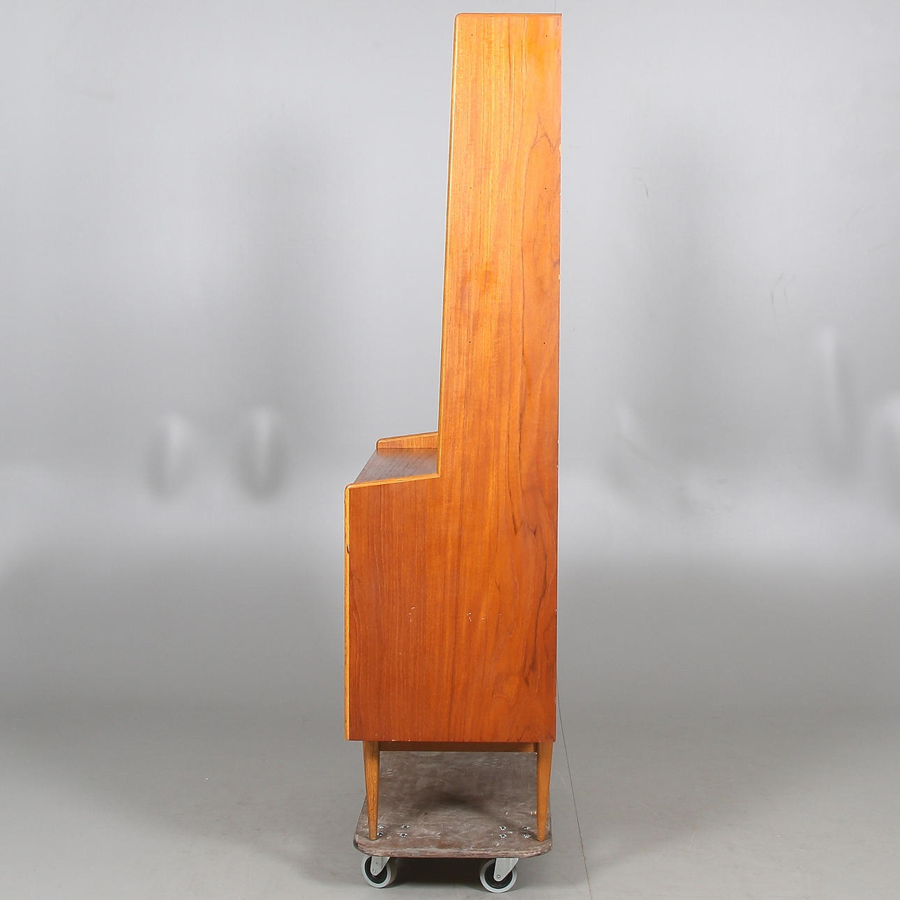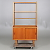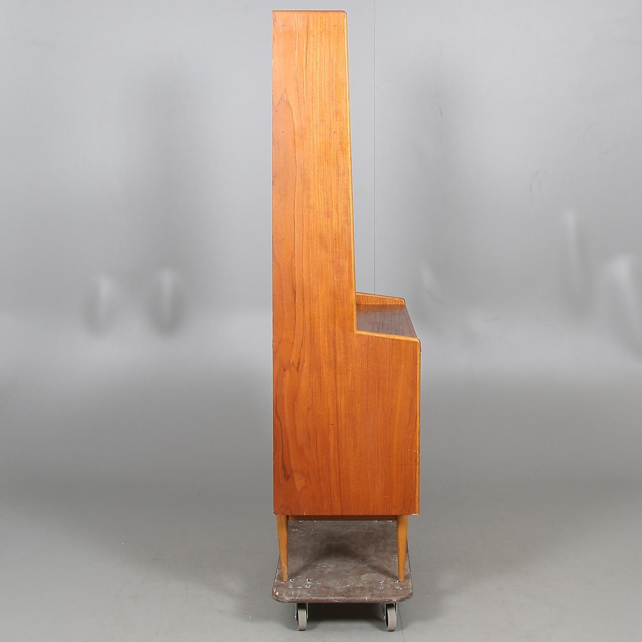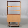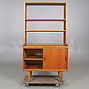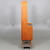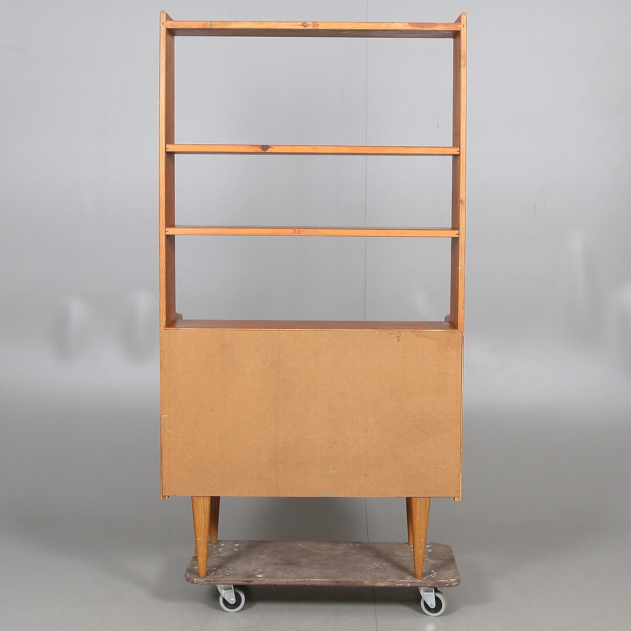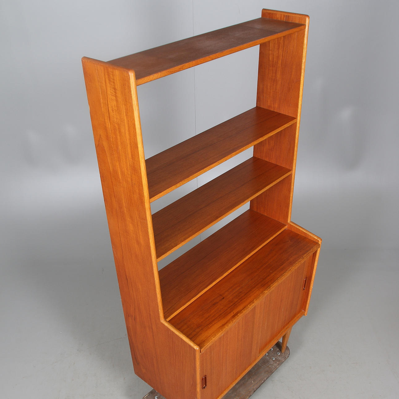 Bokhylla och underskåp med ett par skutdörrar och bakomvarande hyllplan. Bokhylla med två hyllplan. Längd 85, bredd 40, höjd 165 cm.