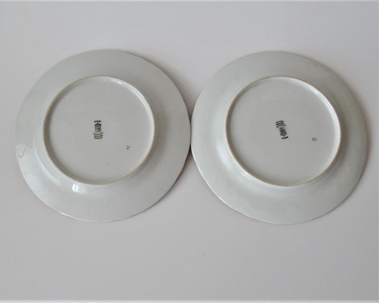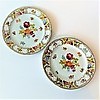 Två porslinstallrikar, med blommor, glasyrmålning, färgrik med guldfärgad kant, ca. 19 cm diameter.