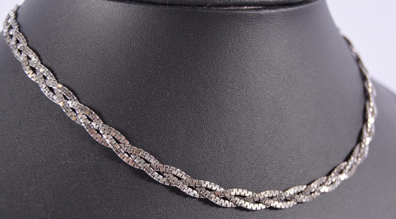 1116911. HALSCOLLIER, silver, flätad med säkerhetslås.