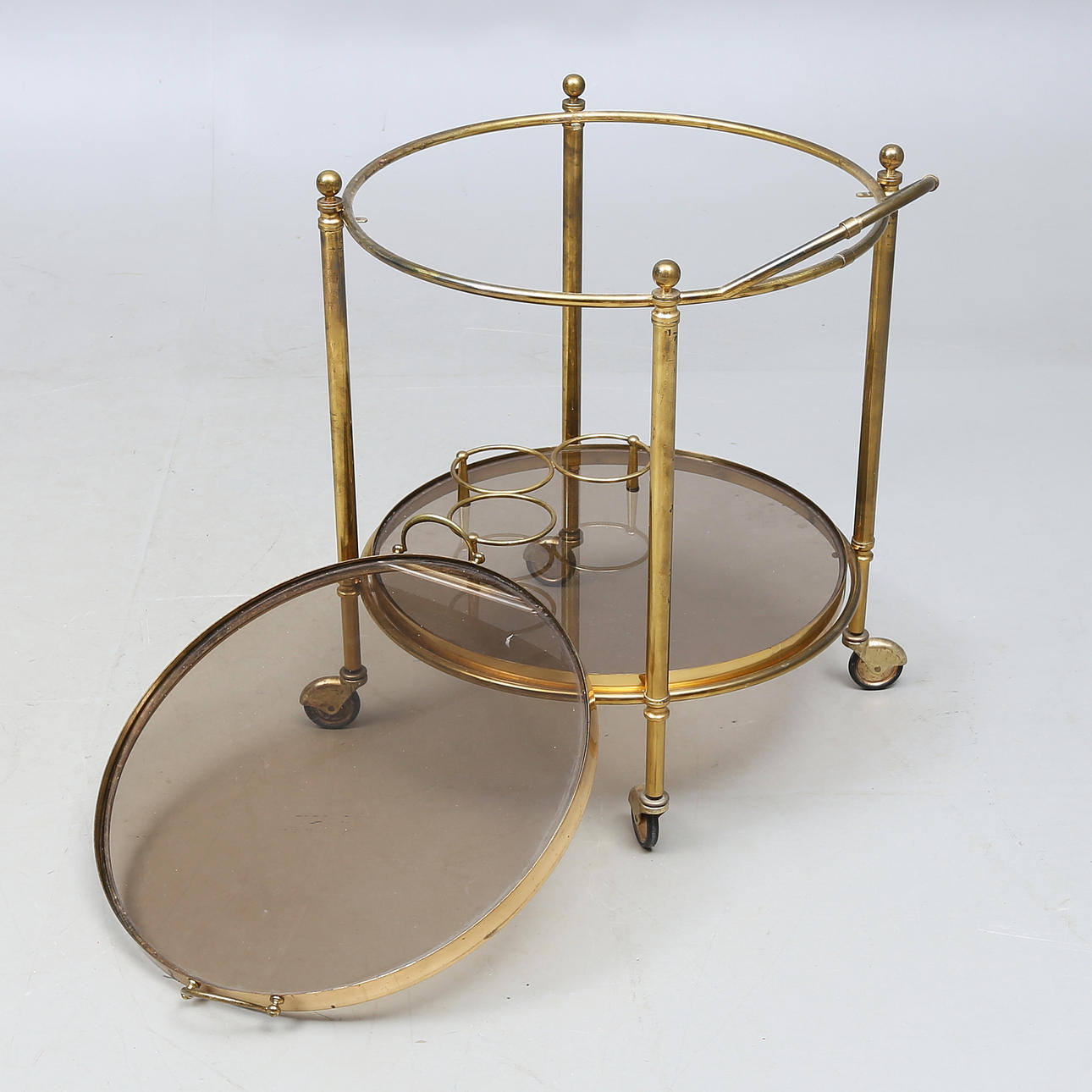 Lös toppskiva med handtag, underliggande skiva med ställ för flaskor. På hjul.