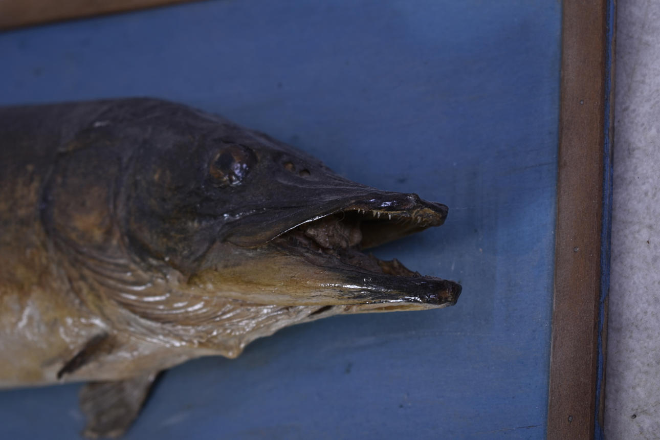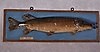 Uppstoppad gädda på montage, 52 x 17,5 cm.