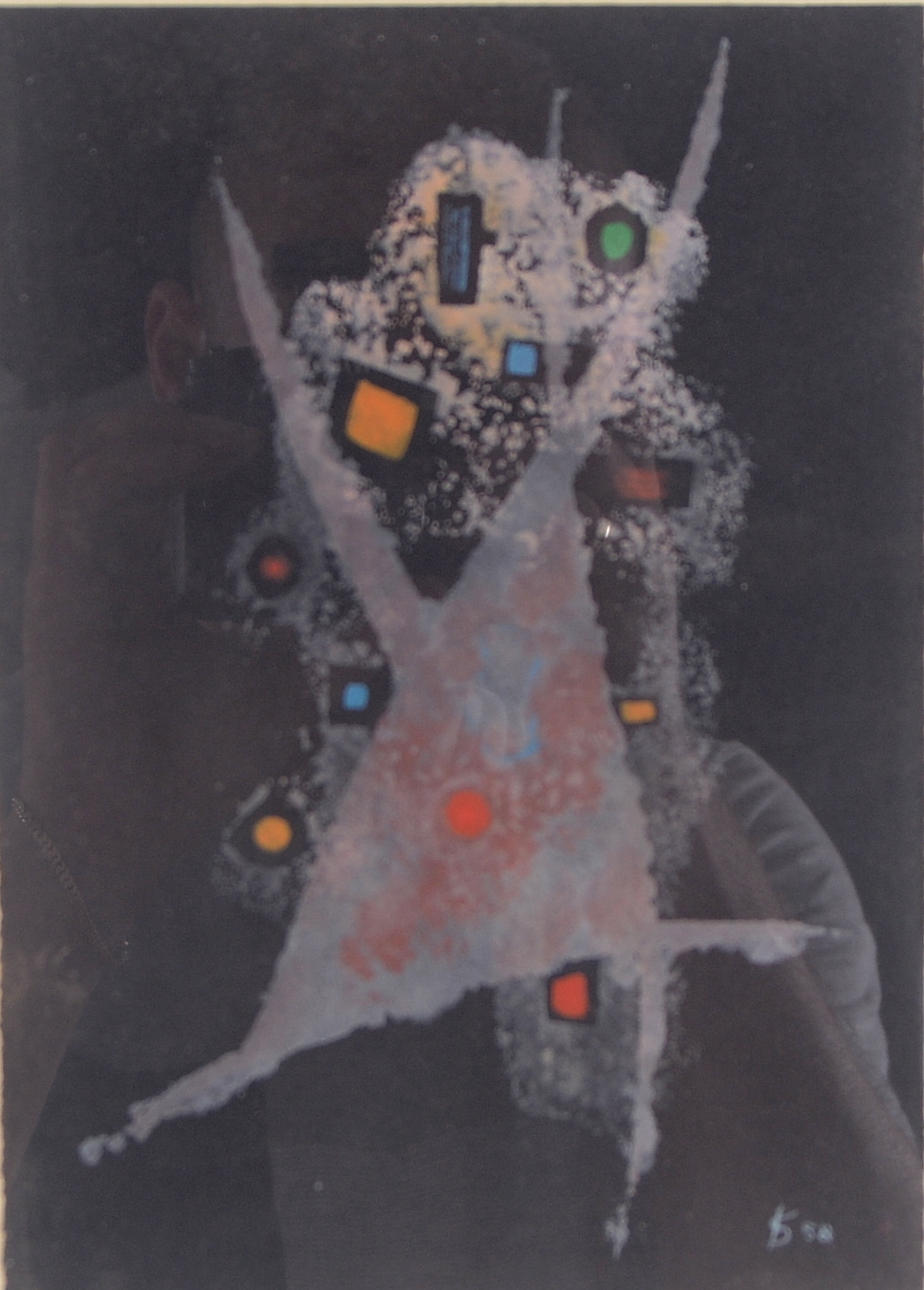 Abstrakt komposition. Oidentifierad monogramsignatur samt daterad -58. 21x15 cm.