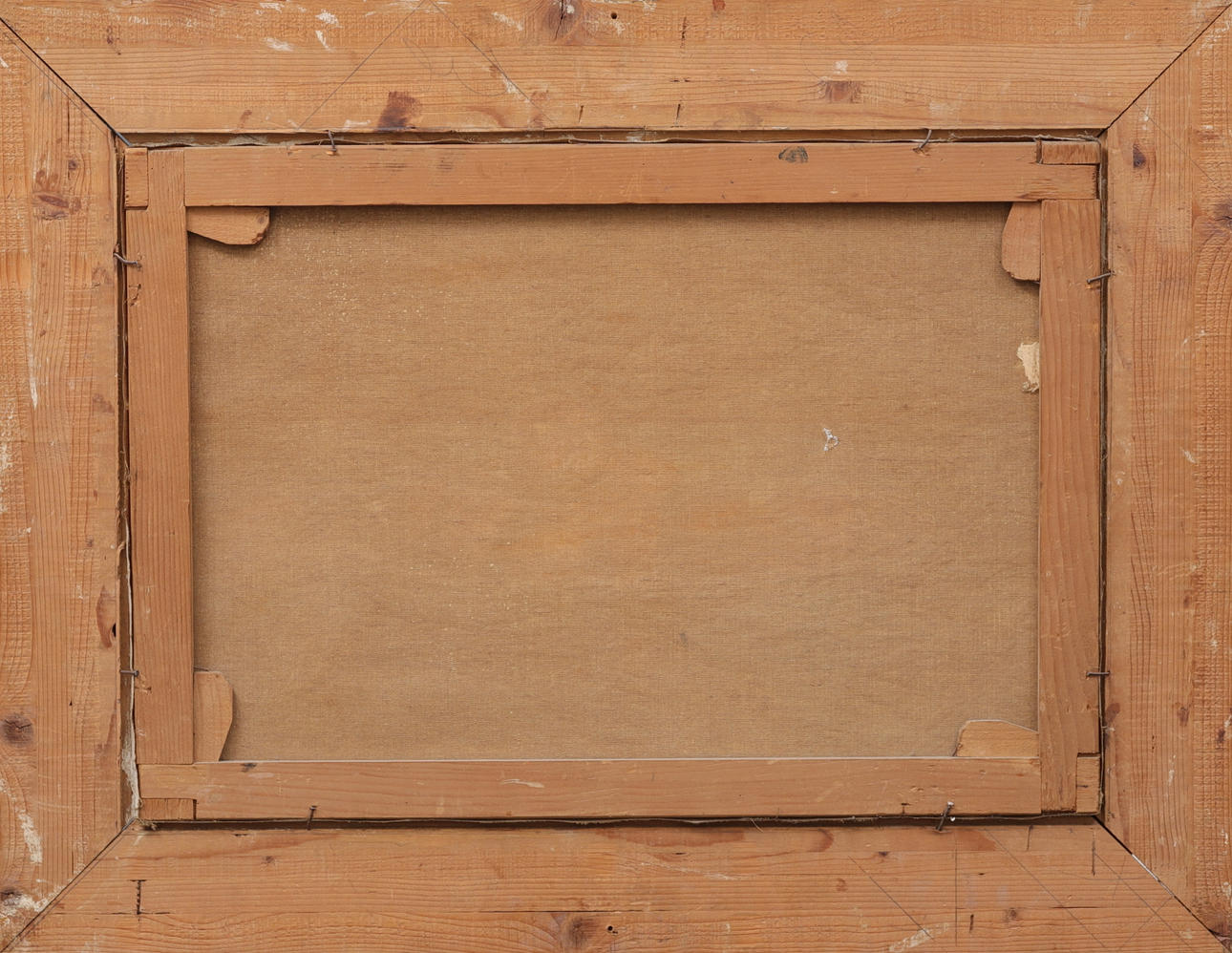 Stöd restaureringar och bildåterintegreringar. Stomme i gjutet och förgyllt trä, med defekter.