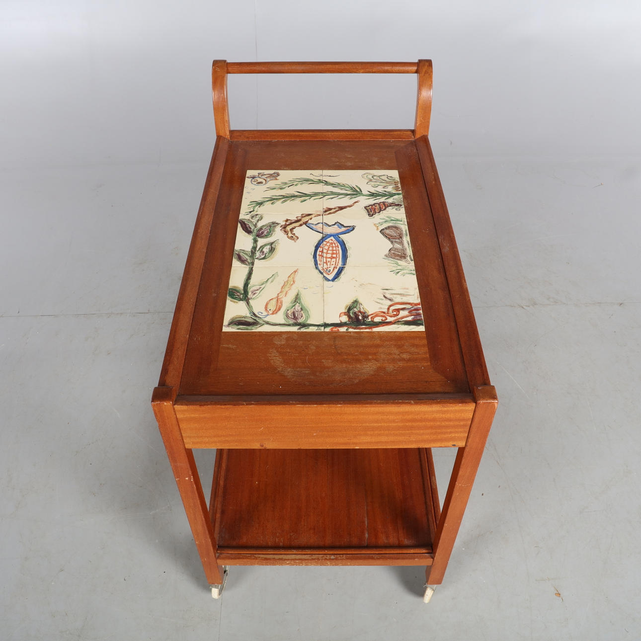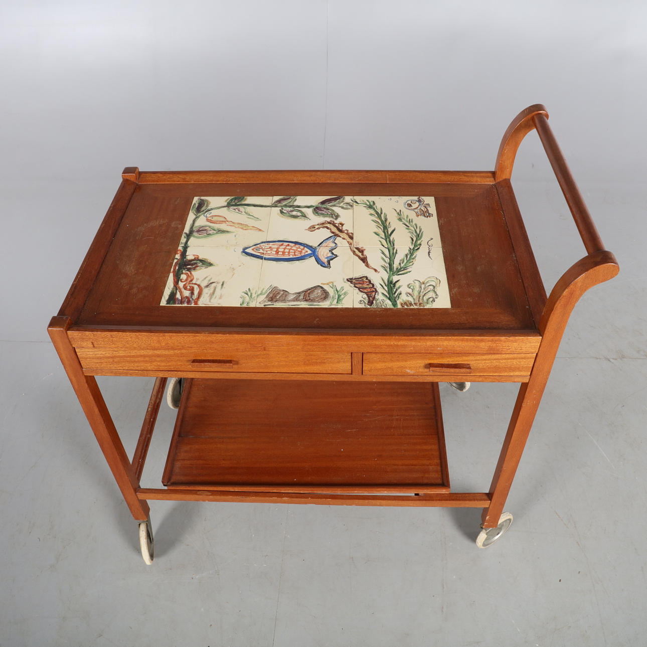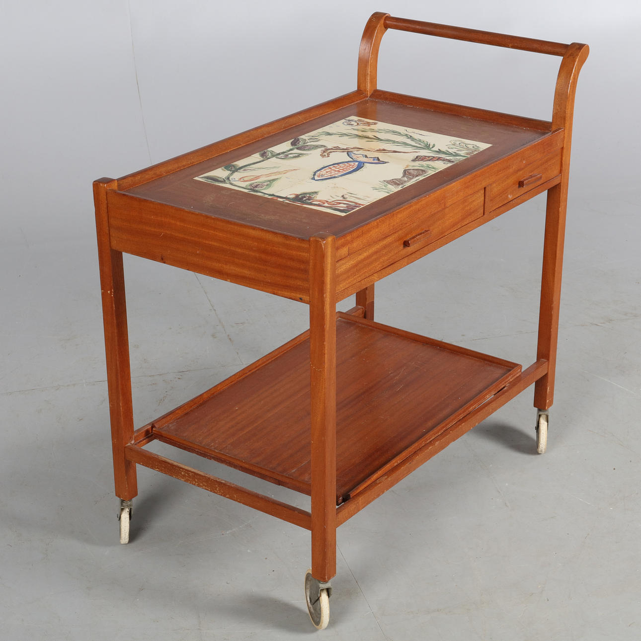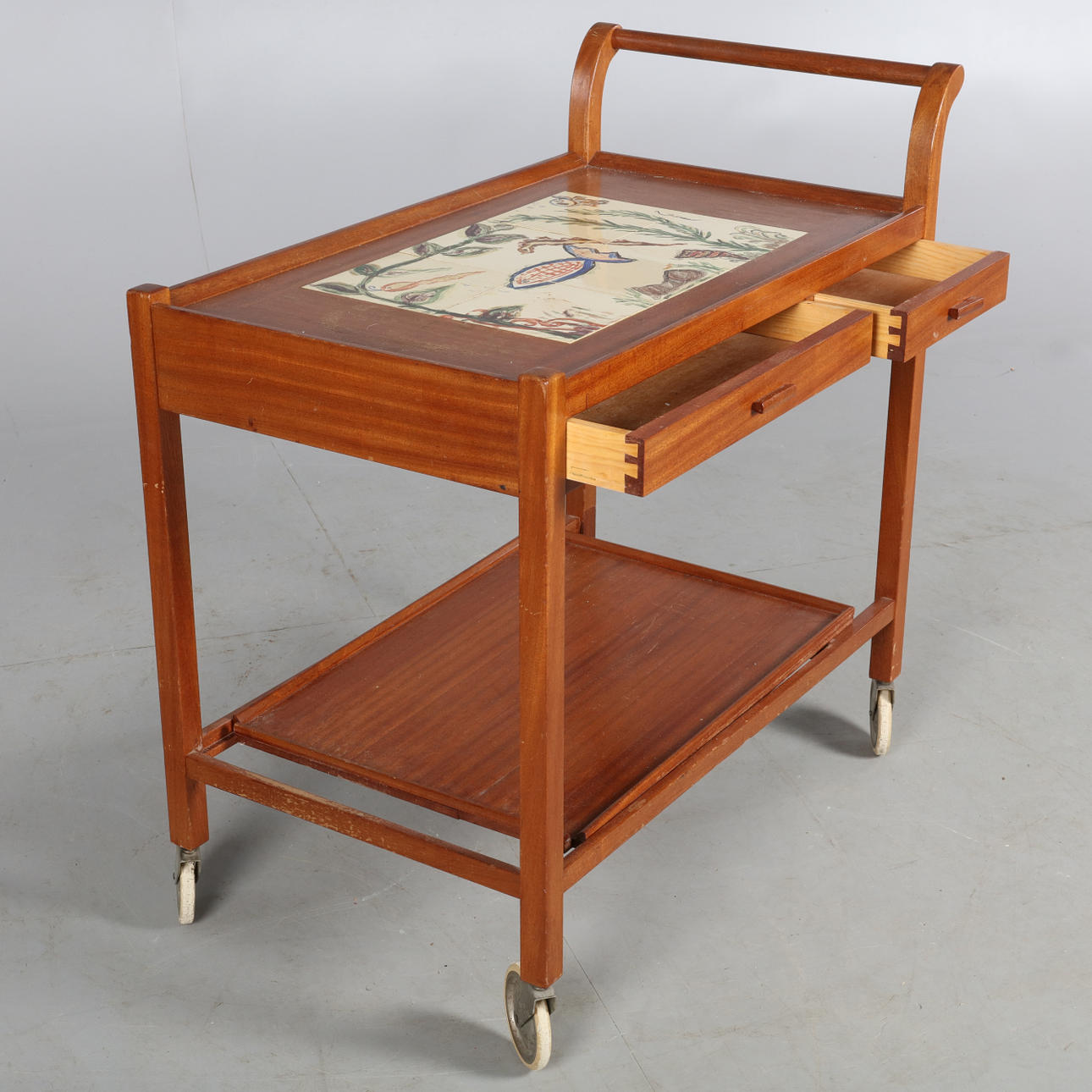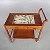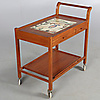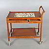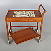 Serveringsvagn med kakel och lådor i sargen samt löstagbar bricka.
