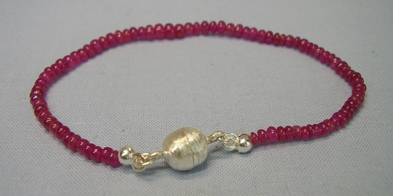 Armbandet är tillverkat av finpolerade naturliga rubinrondeller av fin färg och underbar transparens. Rundarna är ordnade efter storlek. Den är stängd med en satinerad 925 silverlås med magnetlås.