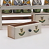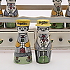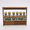 Hylla, höjd 25,5 cm, längd 31,5 cm. Kryddburkar, höjd 11 cm.