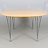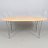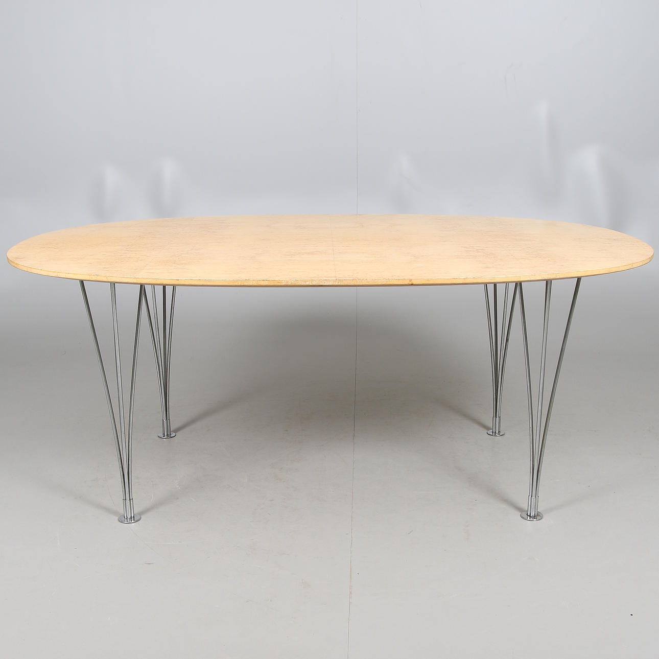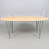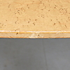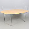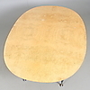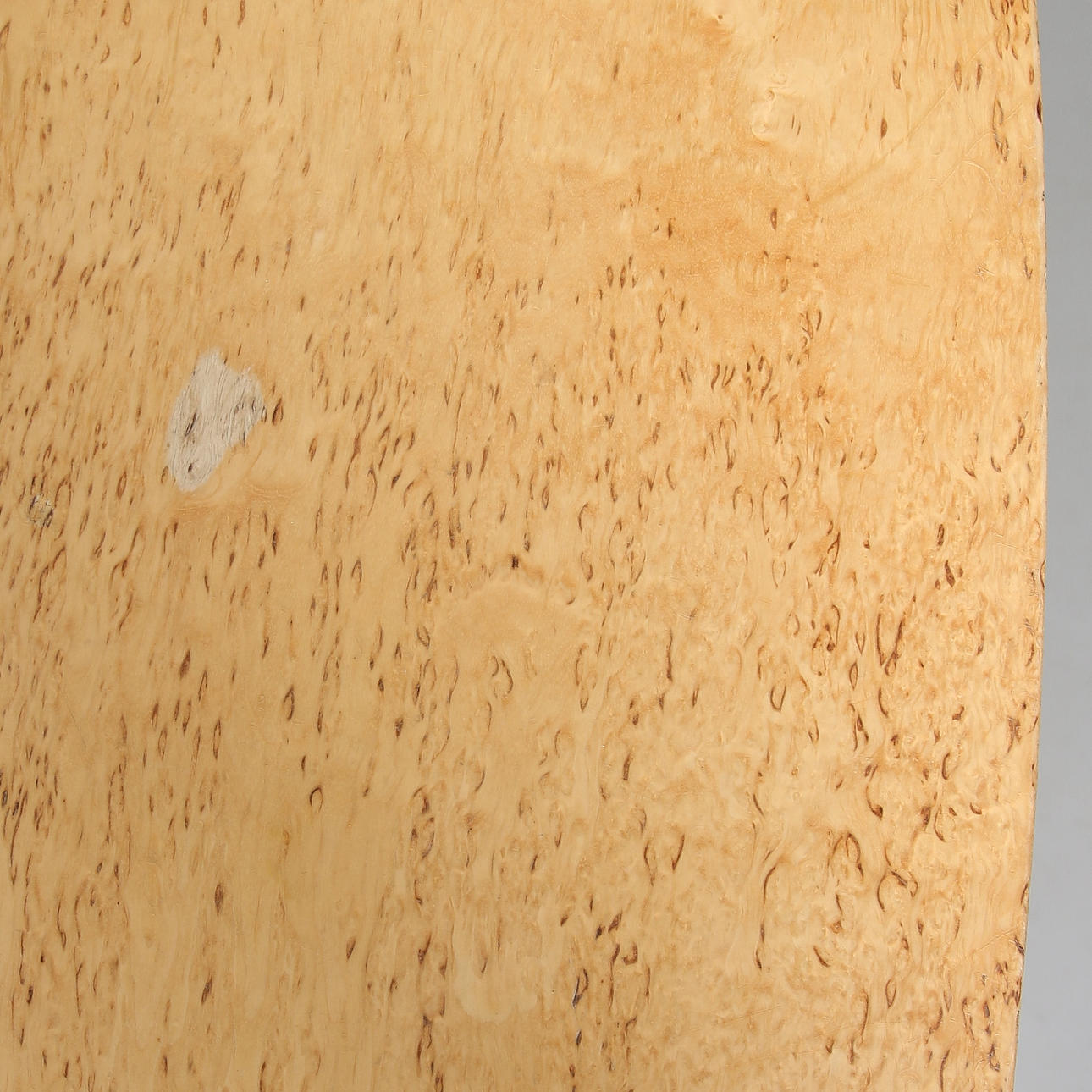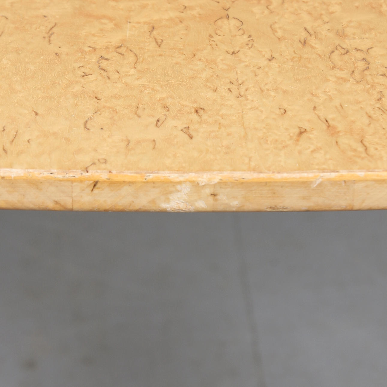 Skiva fanerad med masurbjörk. Ben av kromad metall. Märkt med etikett. Längd 175, bredd 126, höjd 70 cm.