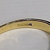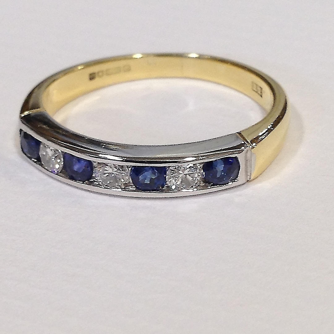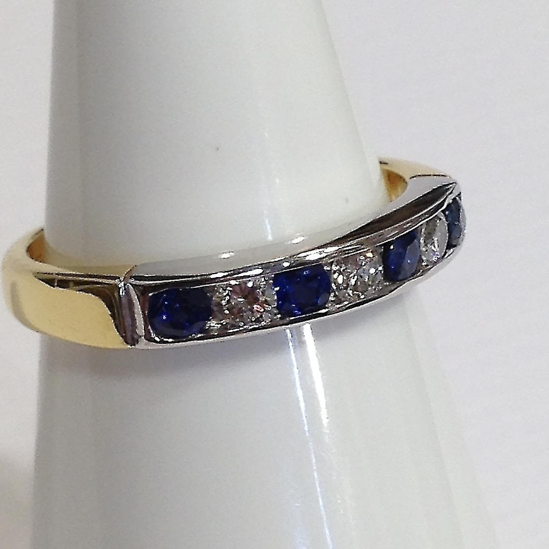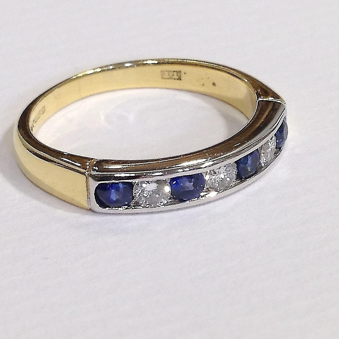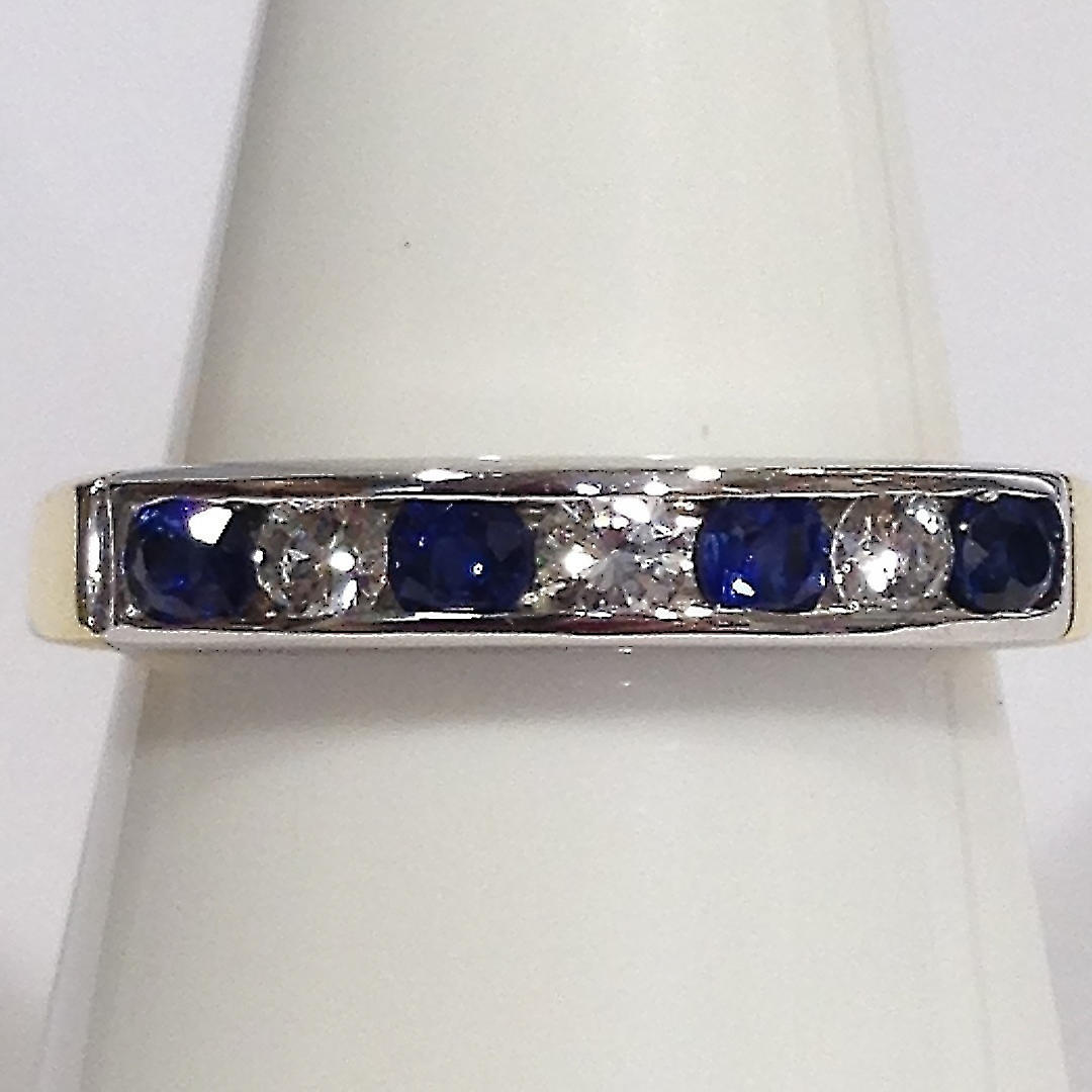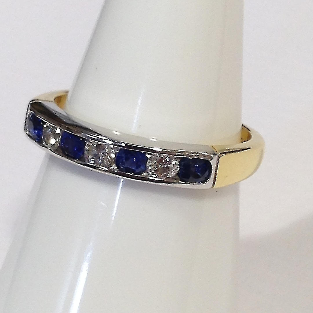 Ringen är växelvis med 4 x rundslipade blå safirstenar och 3 x runda, briljantslipade diamanter.