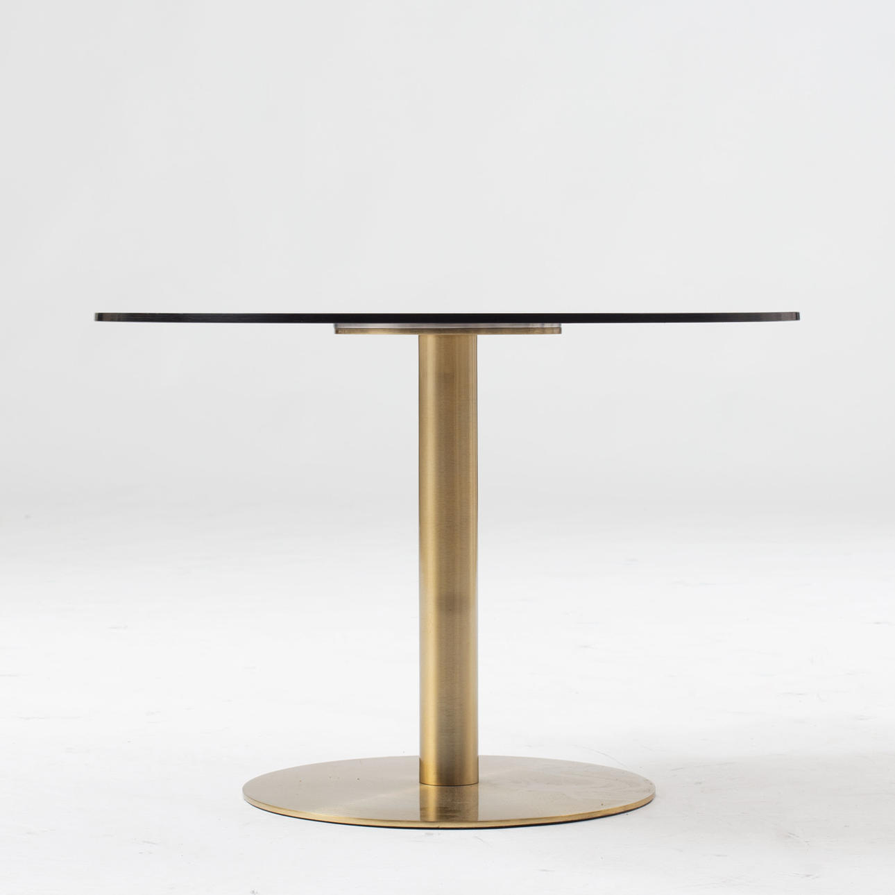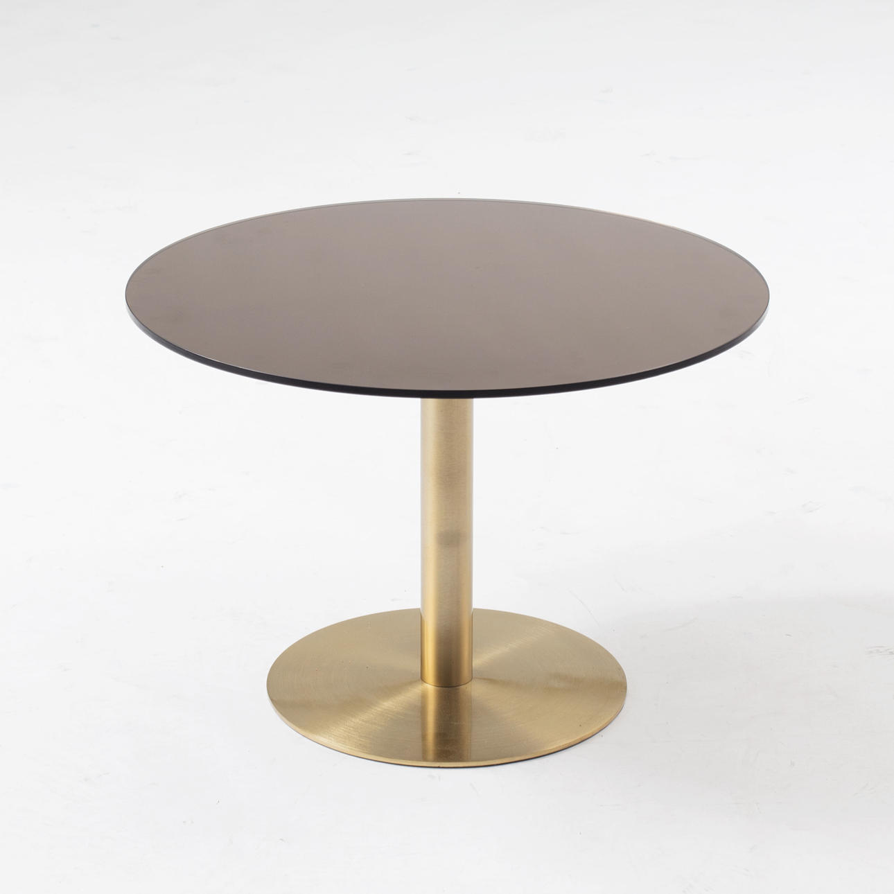 Mässingsfot med rund skiva i bronsbelagt glas. Diameter 60, höjd 40 cm.