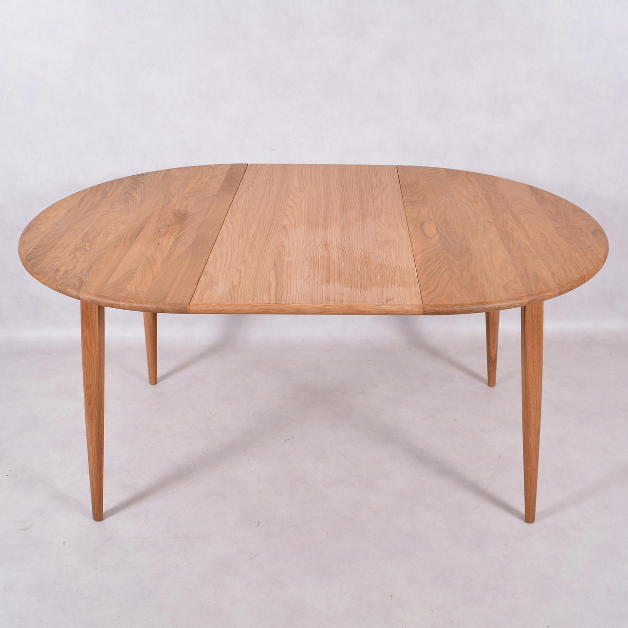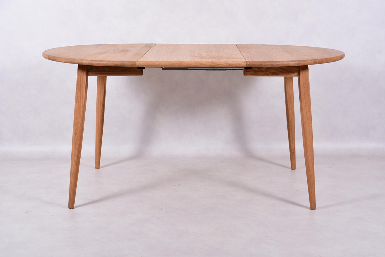 Diameter 105 cm. Höjd 75 cm. 1 iläggsskiva på 48 cm medföljer.