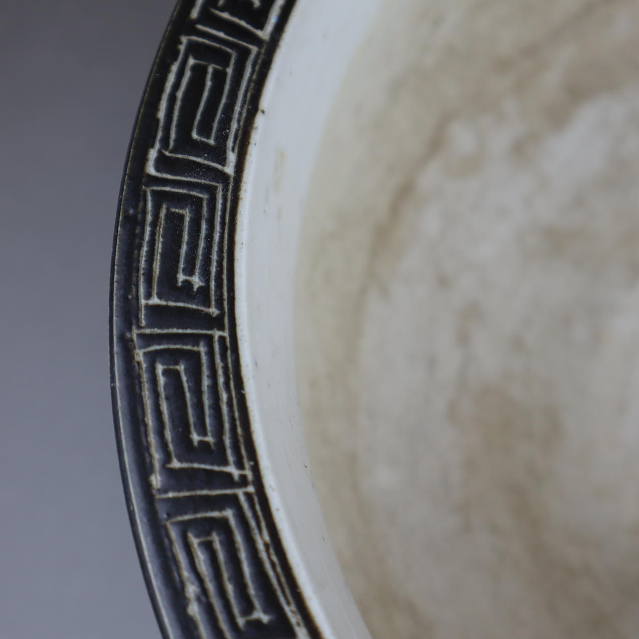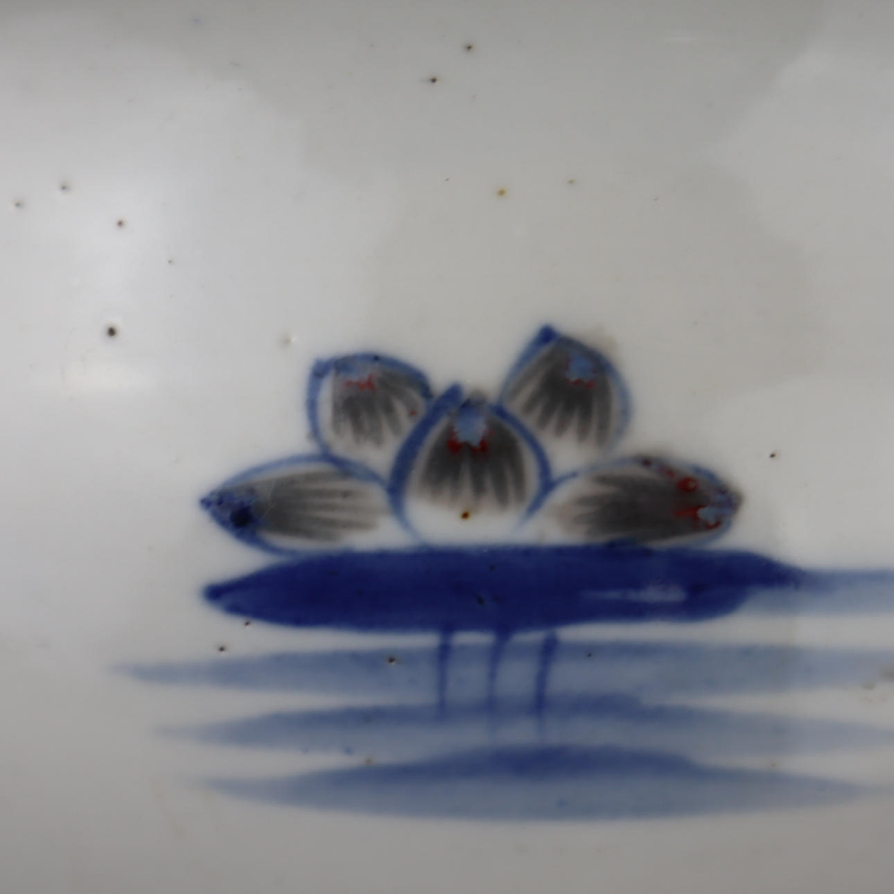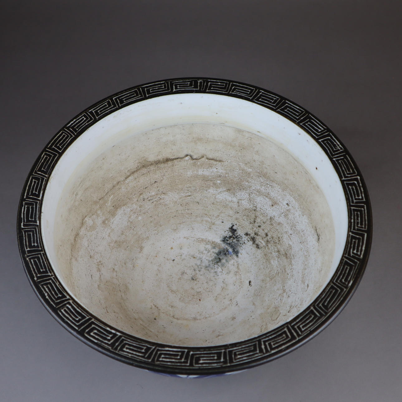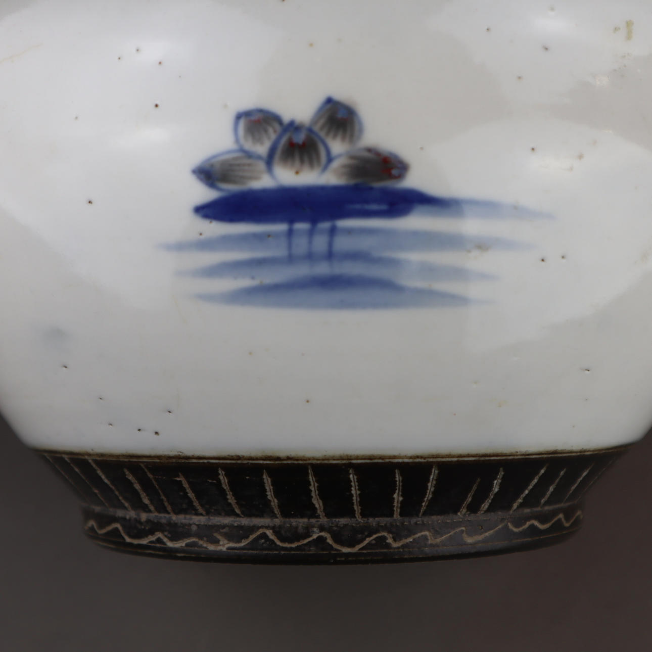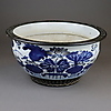 Fiskskål - Kina, allround underglasyr blå damm landskap med lotus växter, täckt av grå glasyr, delvis brun glaserad med scratch dekoration, H./D.Ca.13/27cm.
