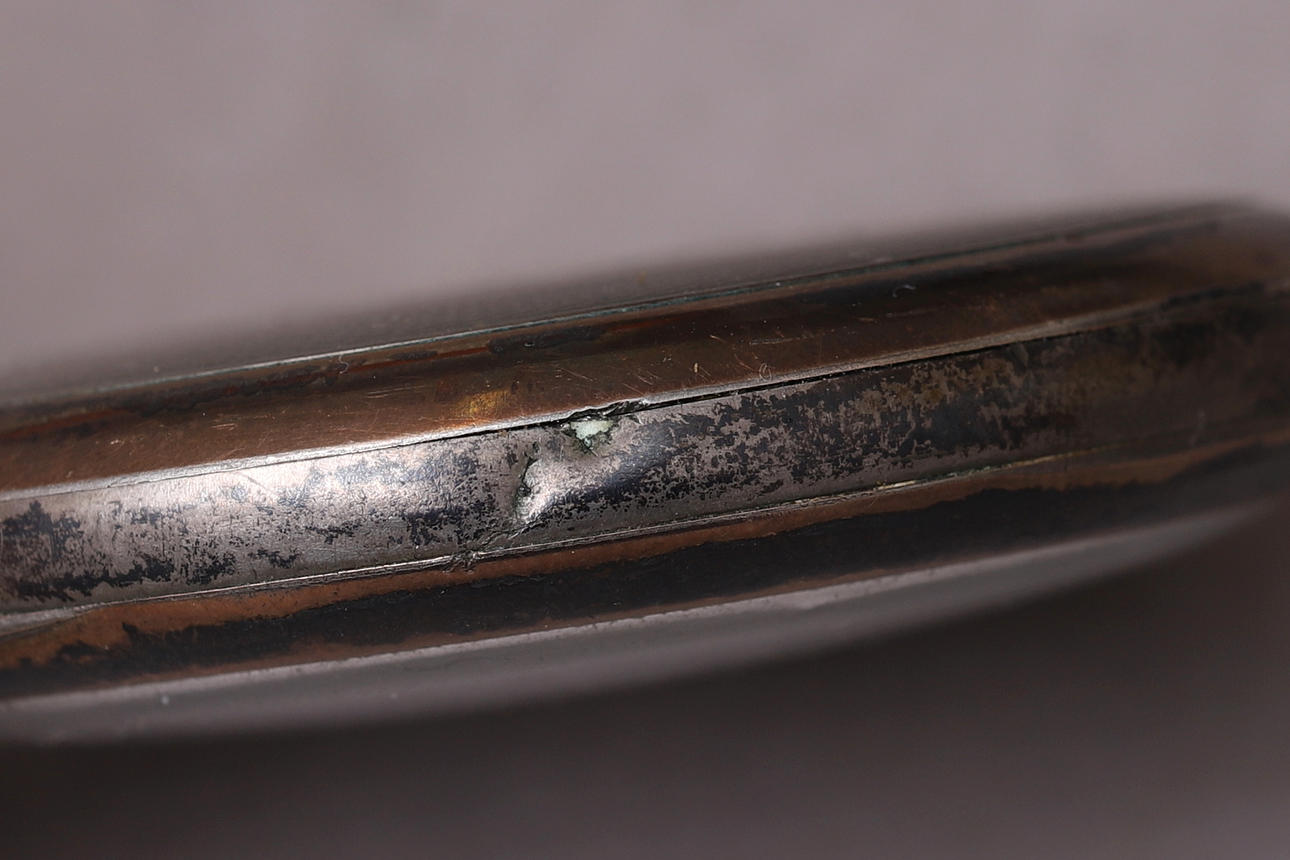 Monogramgraverad baksida. Gravyr inne ''på 40-årsdagen''. Fungerade vid katalogiseringstillfället. Ingen funktionsgaranti lämnas. Bruksslitage. Mindre skada i boetten bredvid trean.