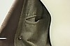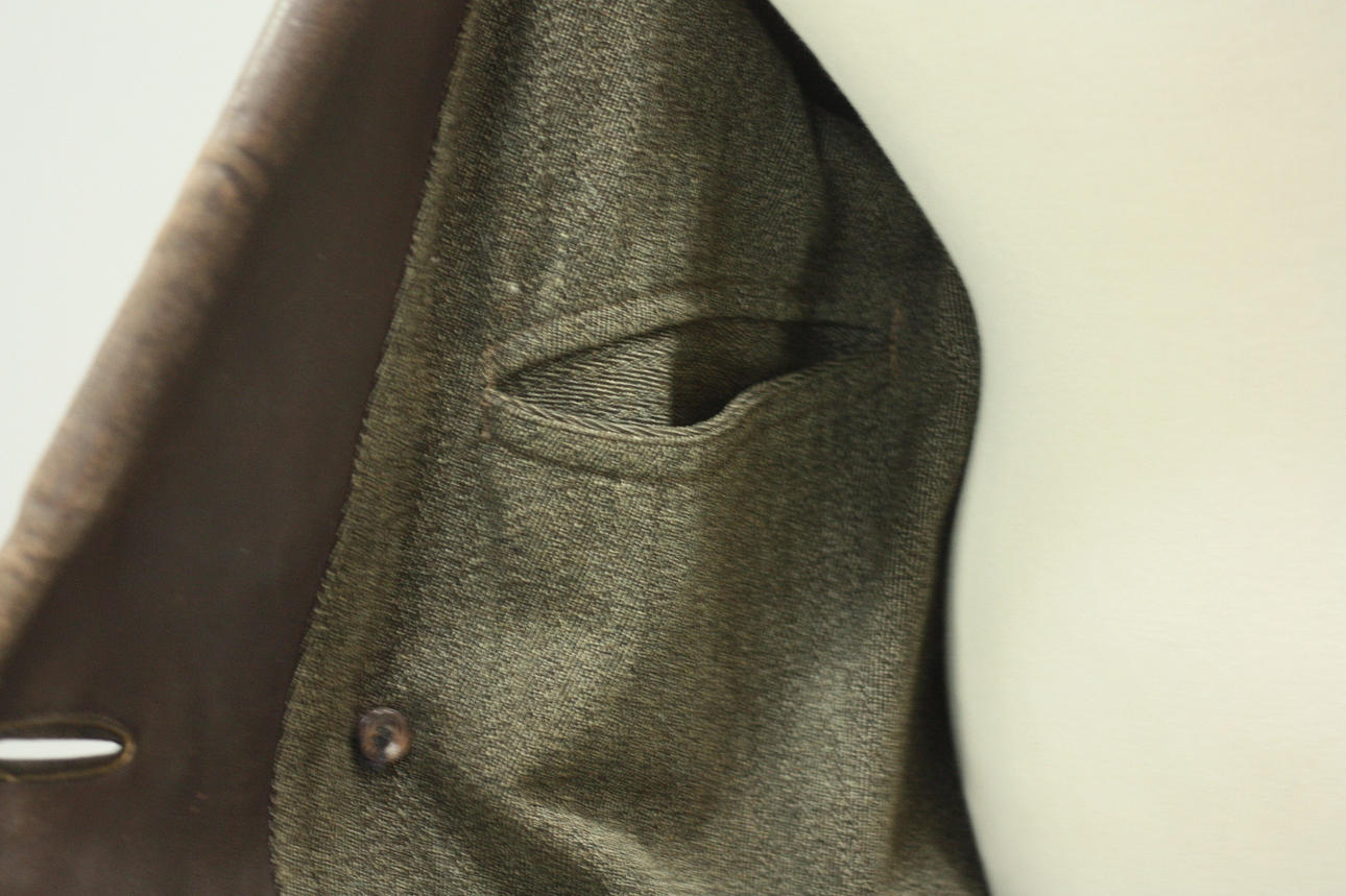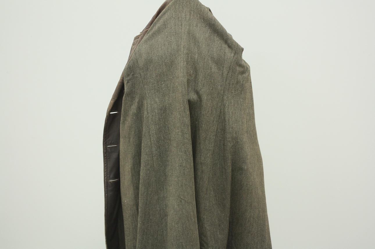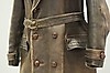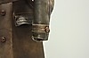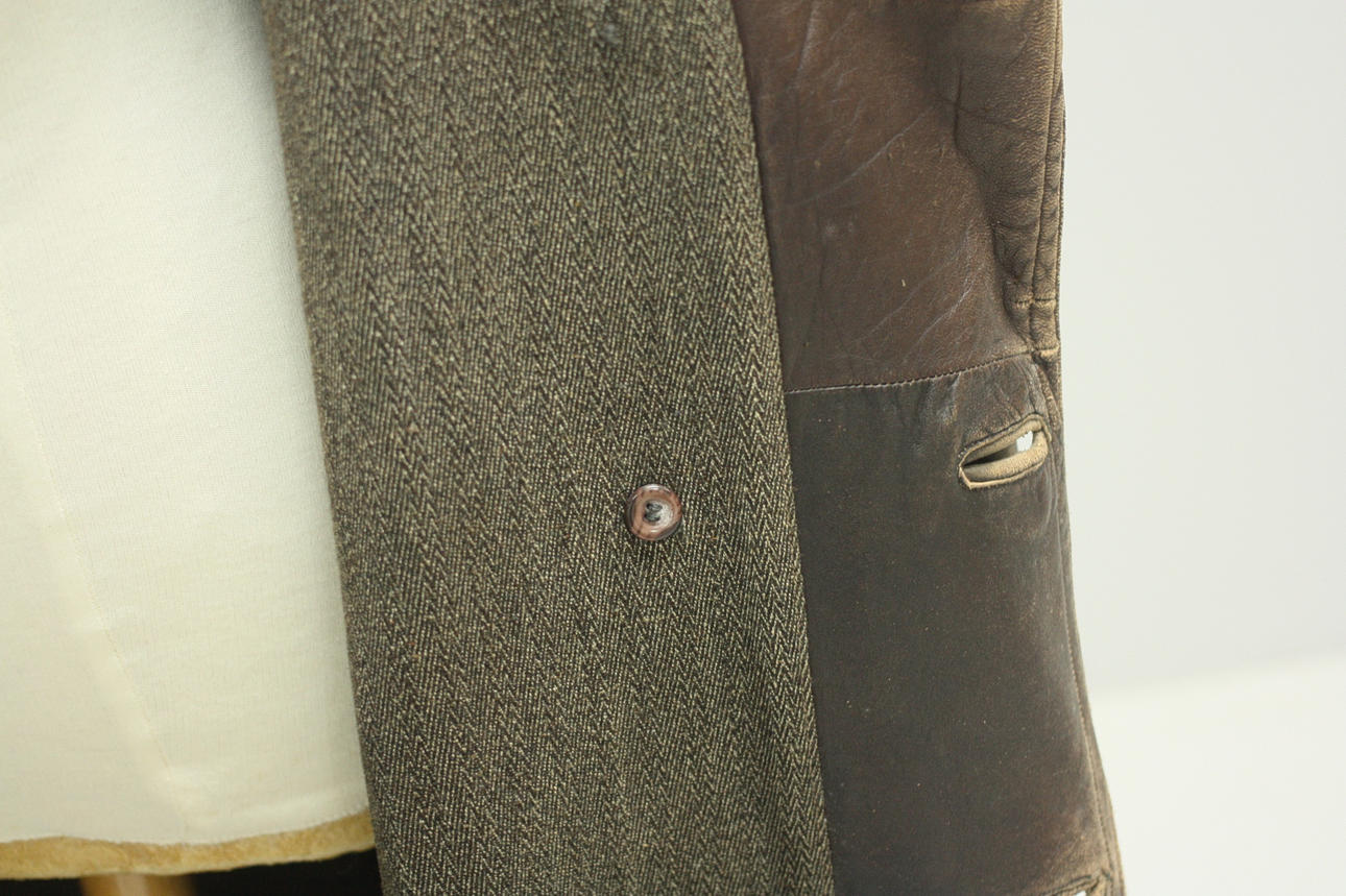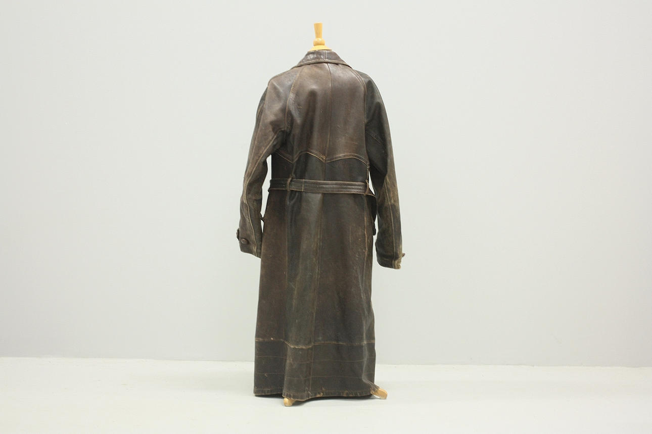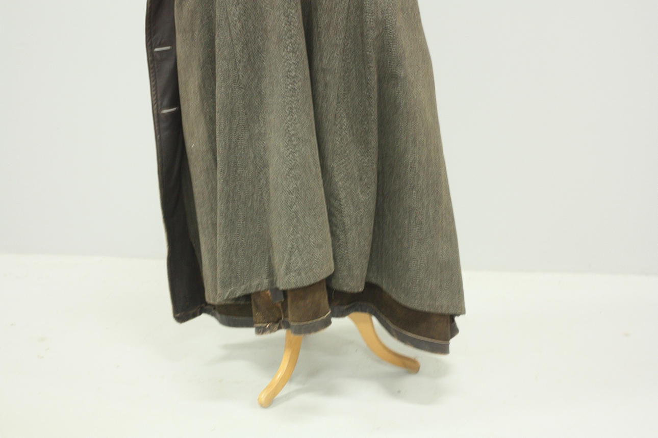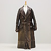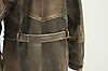 Rock för herr, fodrad, skinn, en innerficka samt fickor på utsida rock. Knäppning med knappar. Bälte.