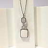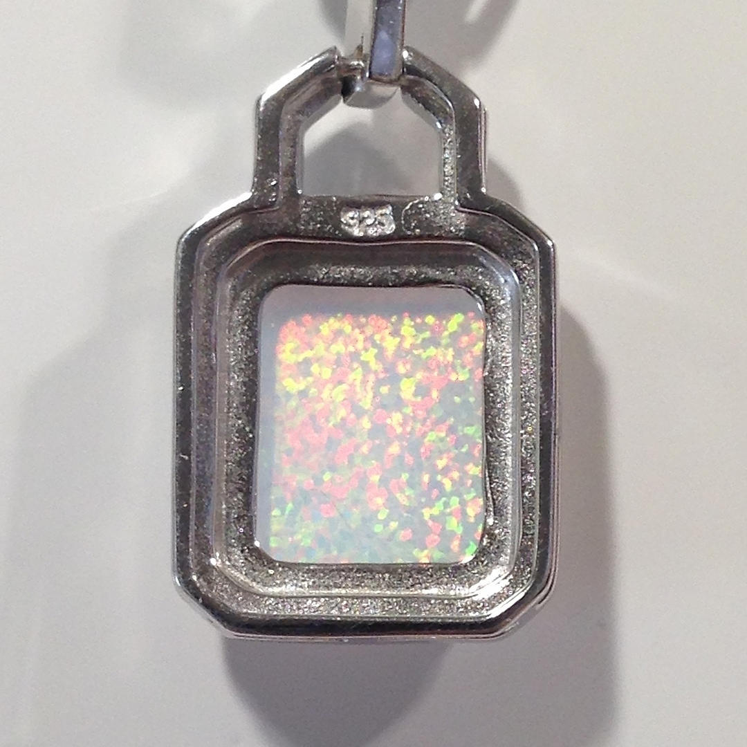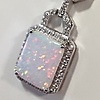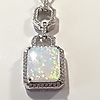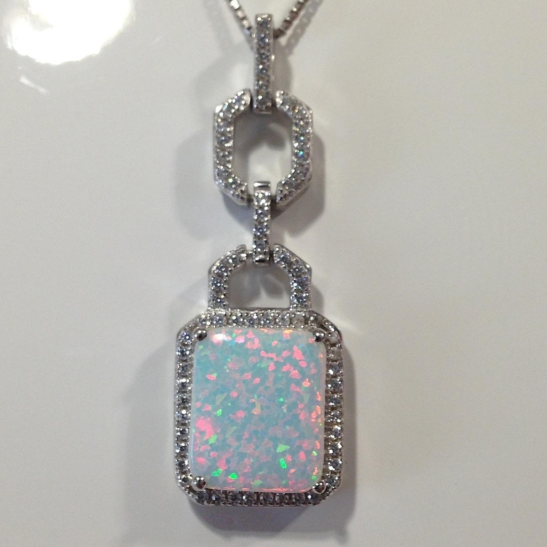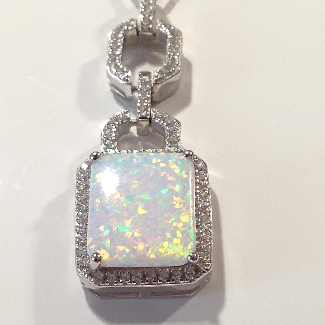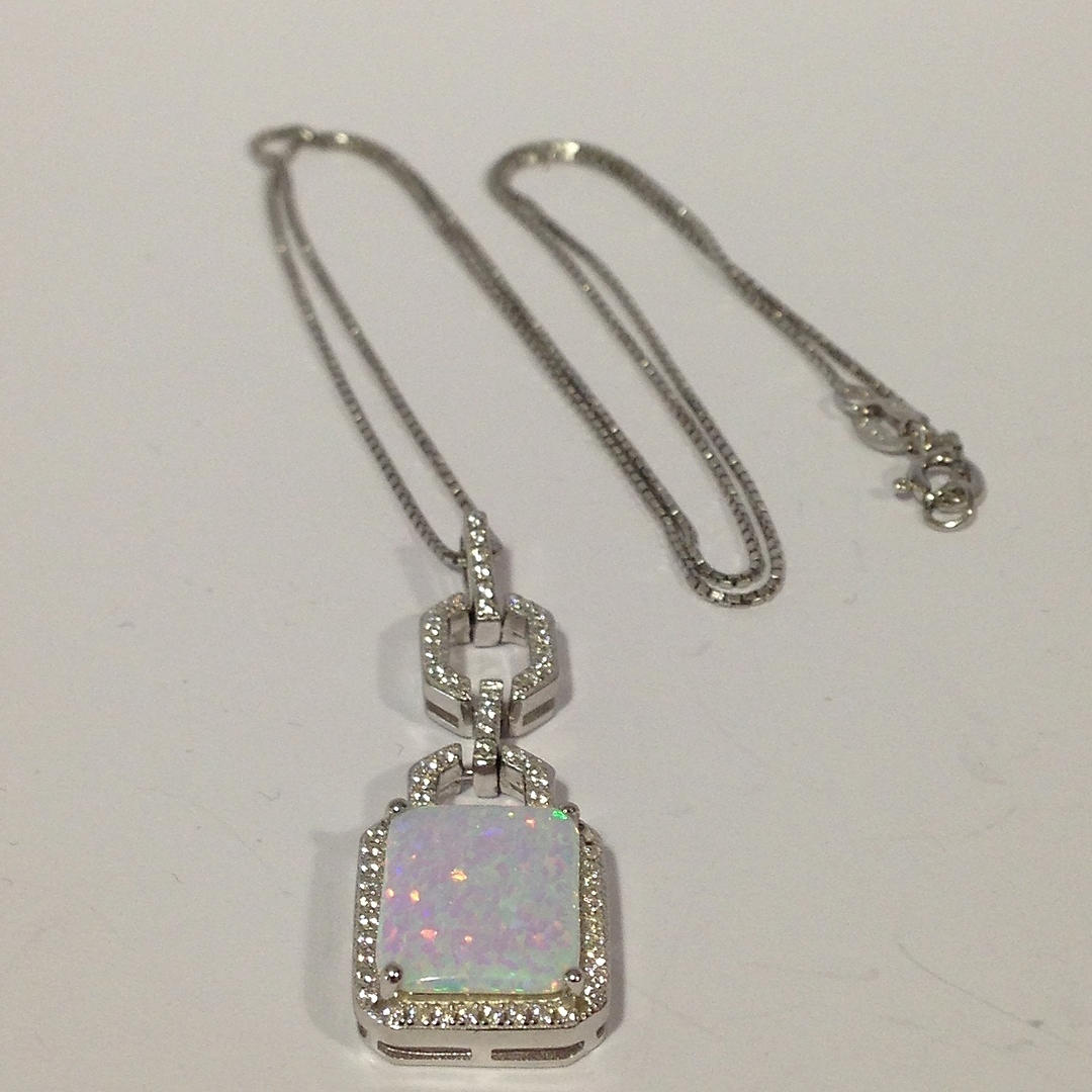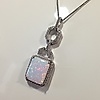 Hänget av detta halsband är inställd med en rektangulär opalit sten i en fyra klo montera. Opalitstenen är omgiven av vita runda briljantskurna cubic zirconia stenar.
