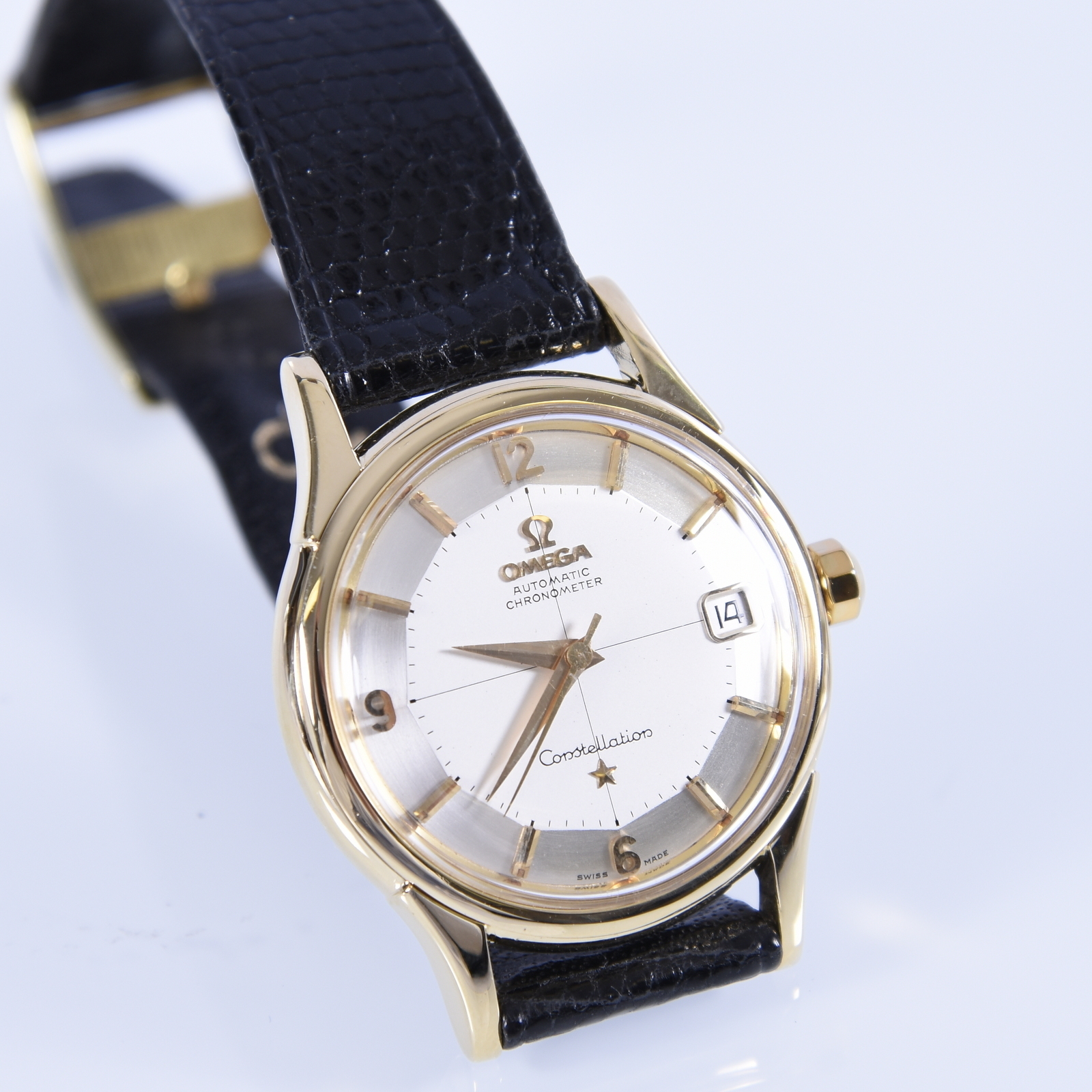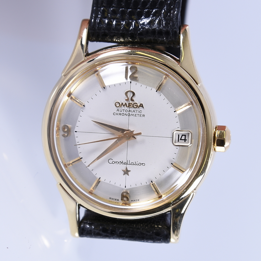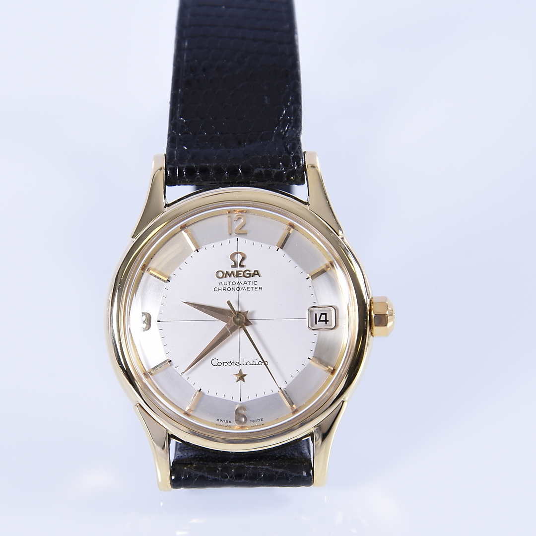 1175109. HERRARMBANDSUR, Omega Constellation Pie-Pan, 18K.