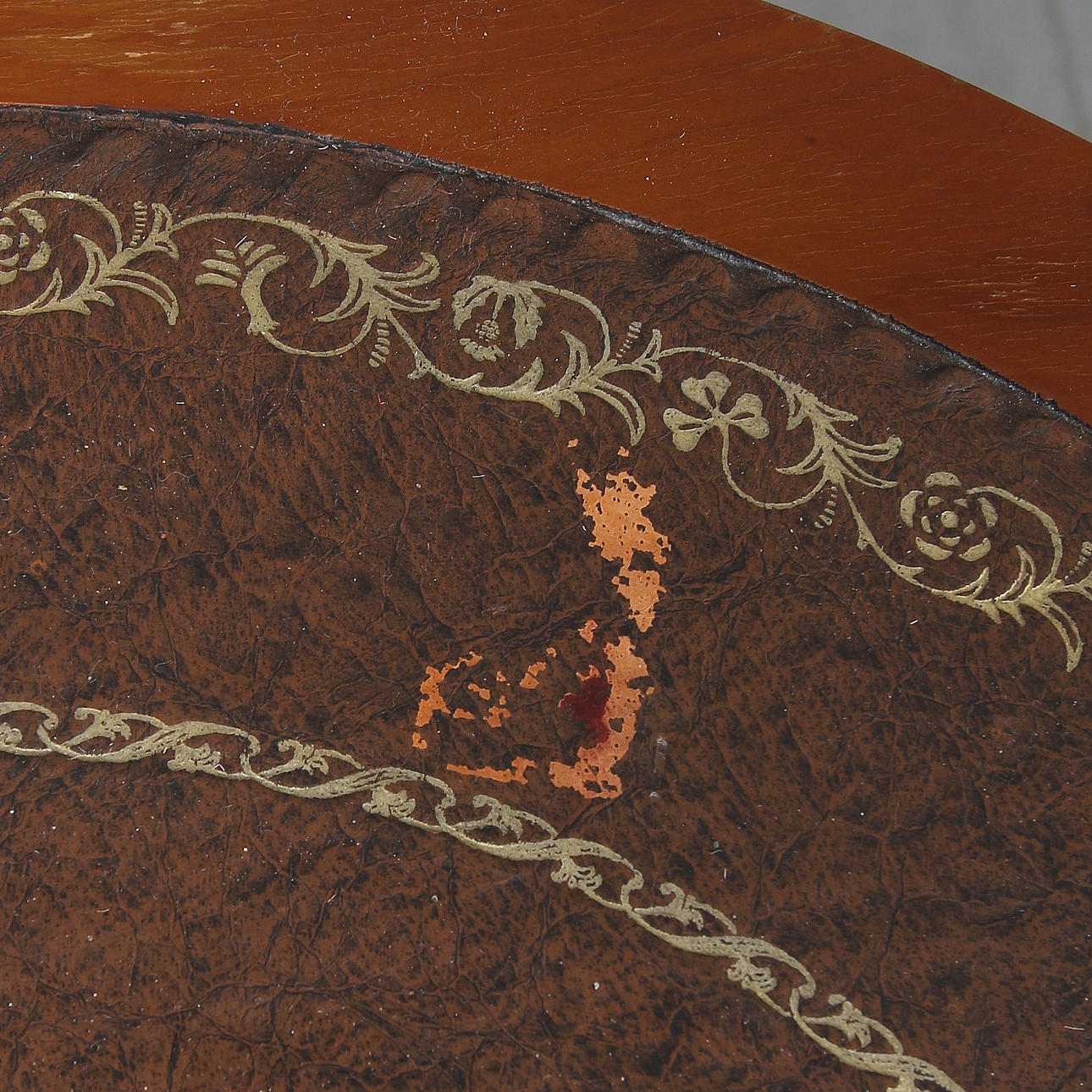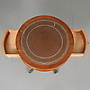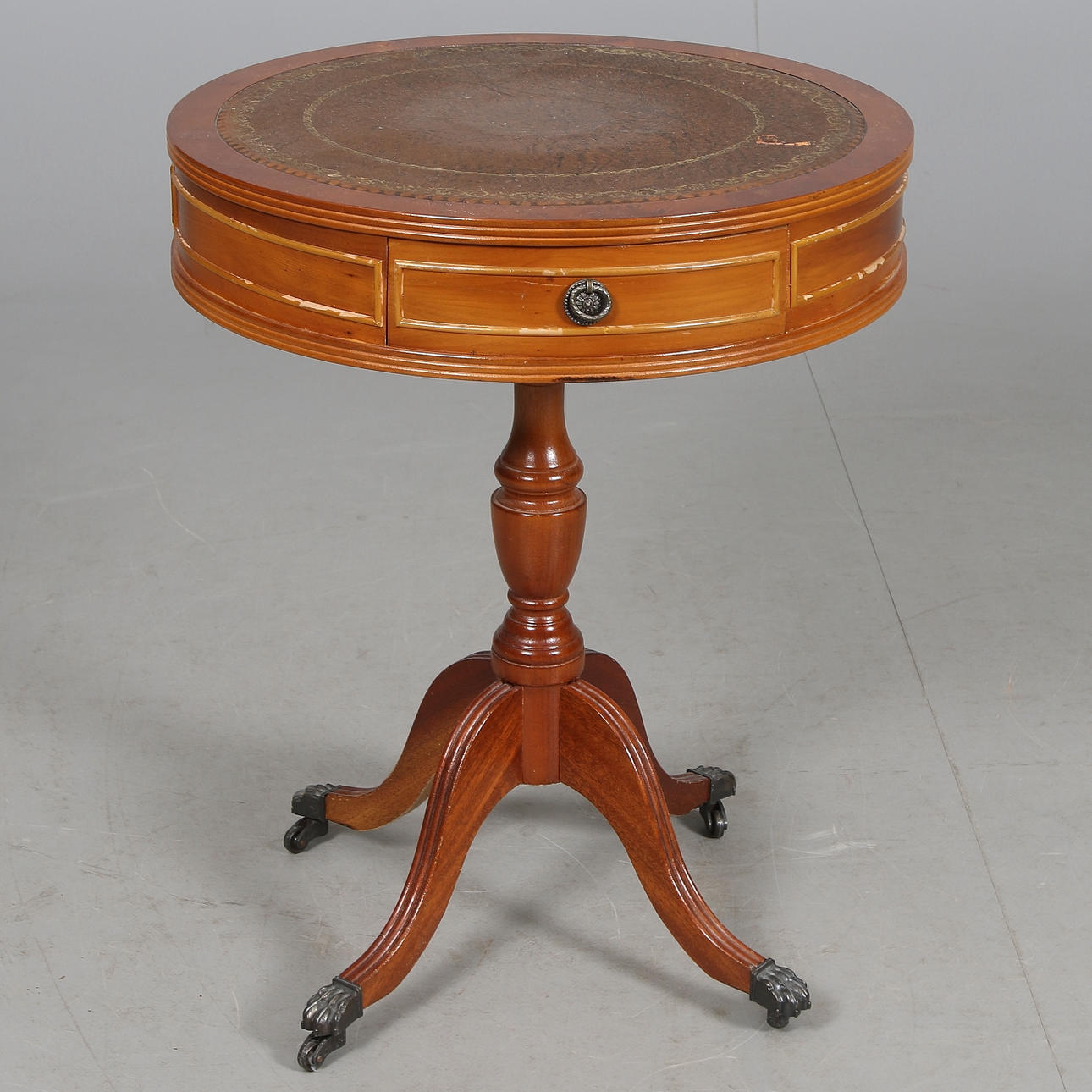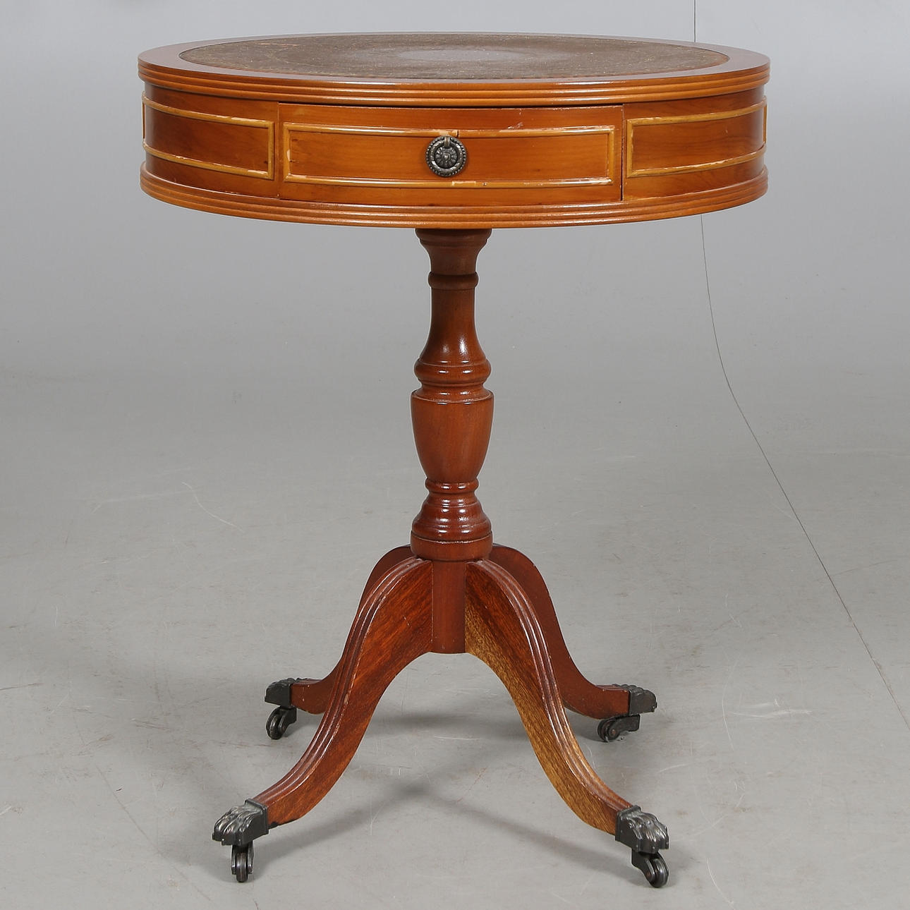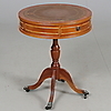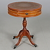 På hjul, med två lådor, skiva klädd med brunt skinn. Diameter 49 cm, höjd 63 cm.