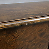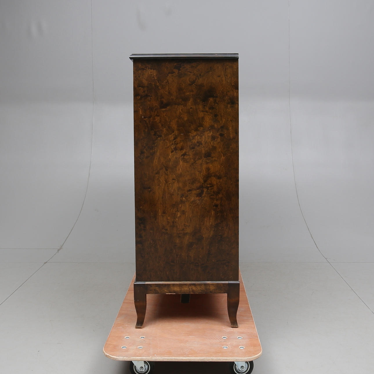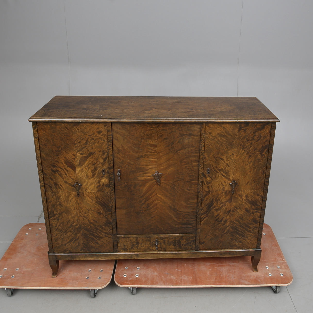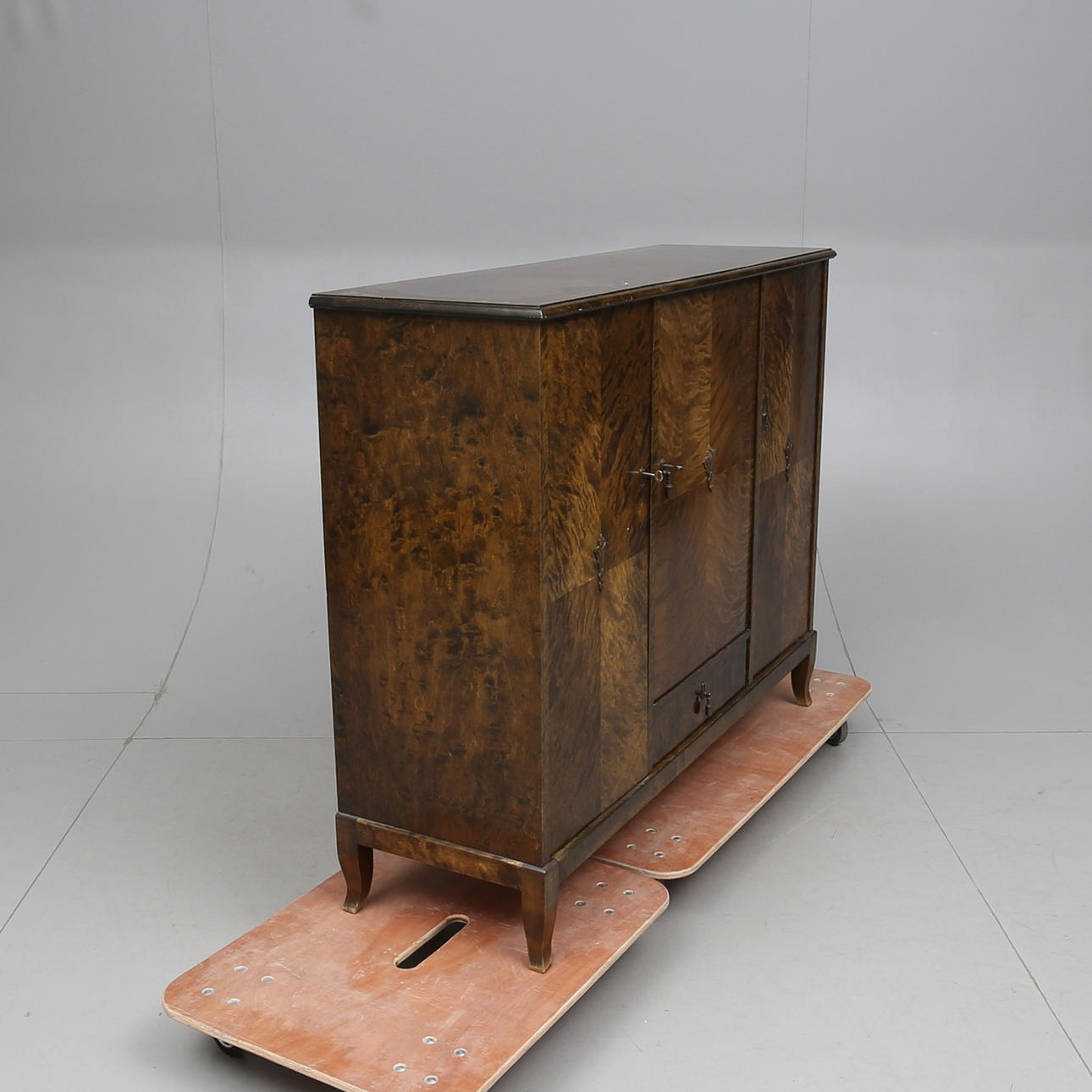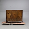 Fanerad med björk. Skuren dekor. Tre dörrar med bakomliggande hyllplan. En låda under mittdörr. Längd 142. bredd 44. Höjd 114 cm.