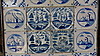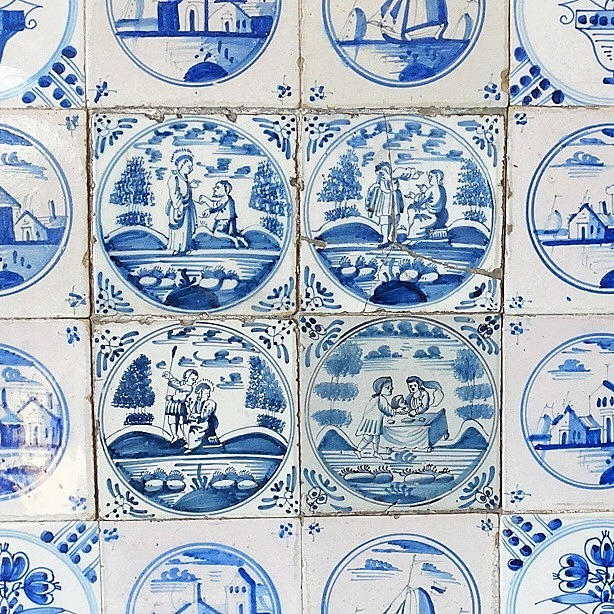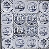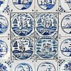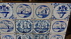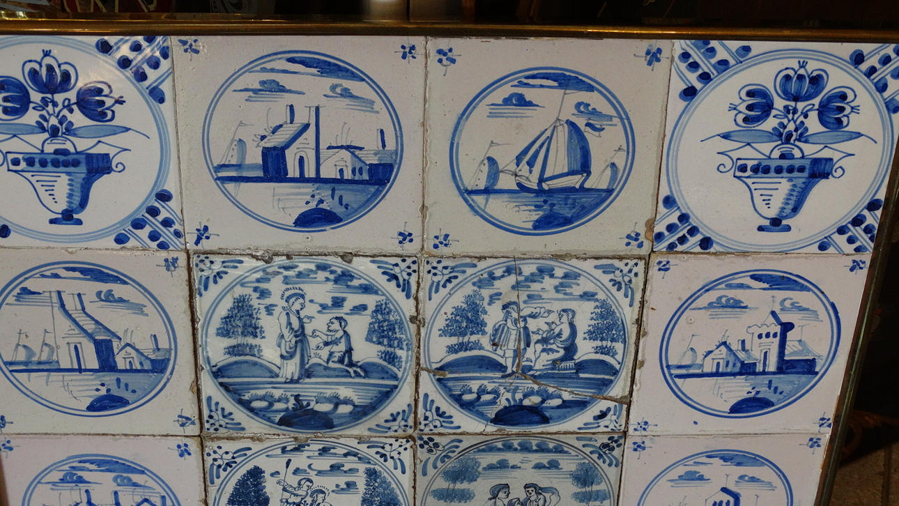 Inramade Delft-plattor, olika motiv, det där. 53 x 53 cm.