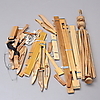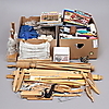 Vävgarner i många olika färger, lin, bomull. Skyttlar i trä. Spolredskap. Vävstolsskedar. Böcker om vävning.