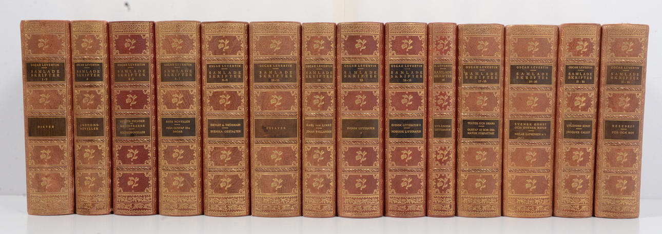 Albert Bonniers Förlag. Stockholm 1914-1918. Bibliofilupplaga om 350, detta nr. 229. 14 volymer. Halvfranska band. Övre guldsnitt.