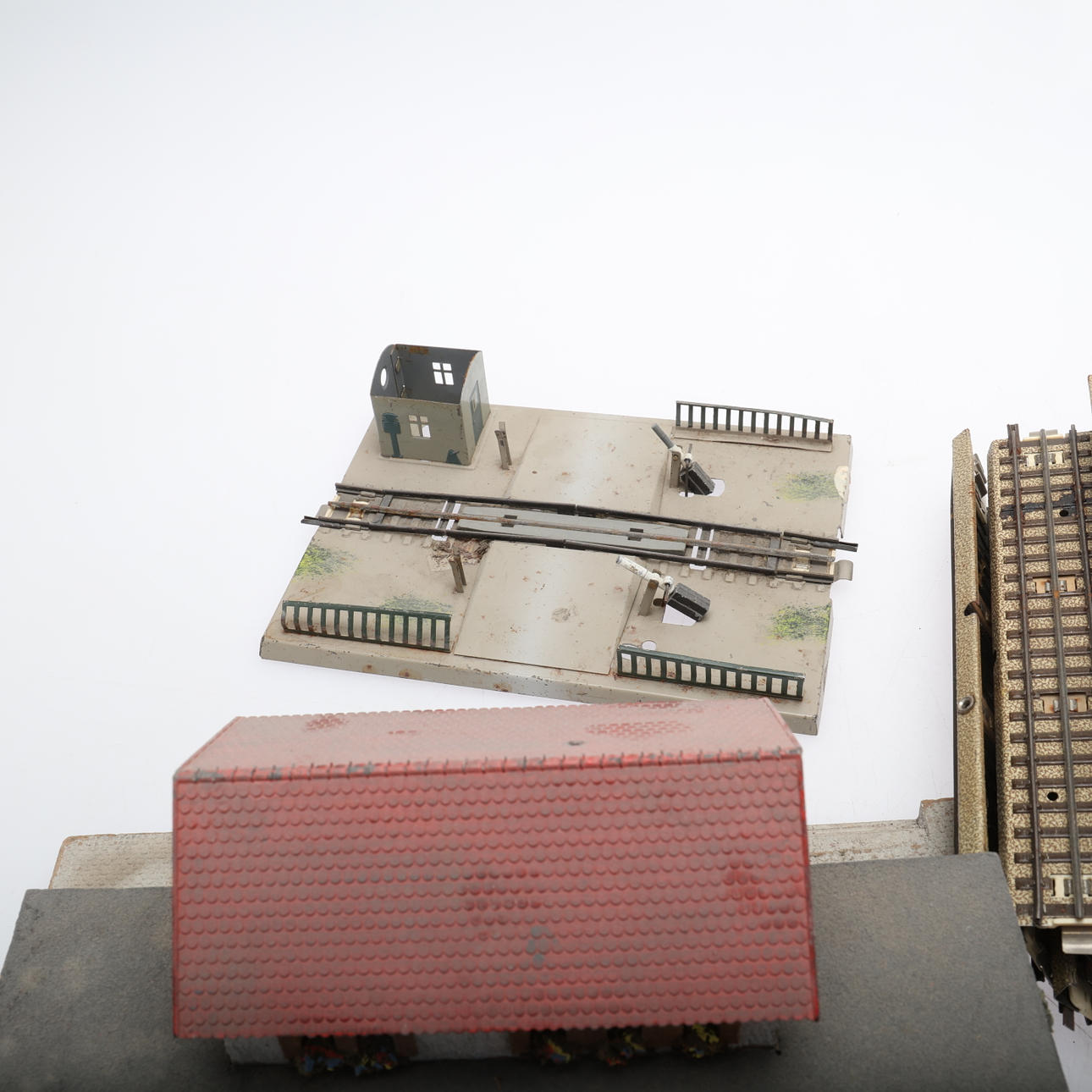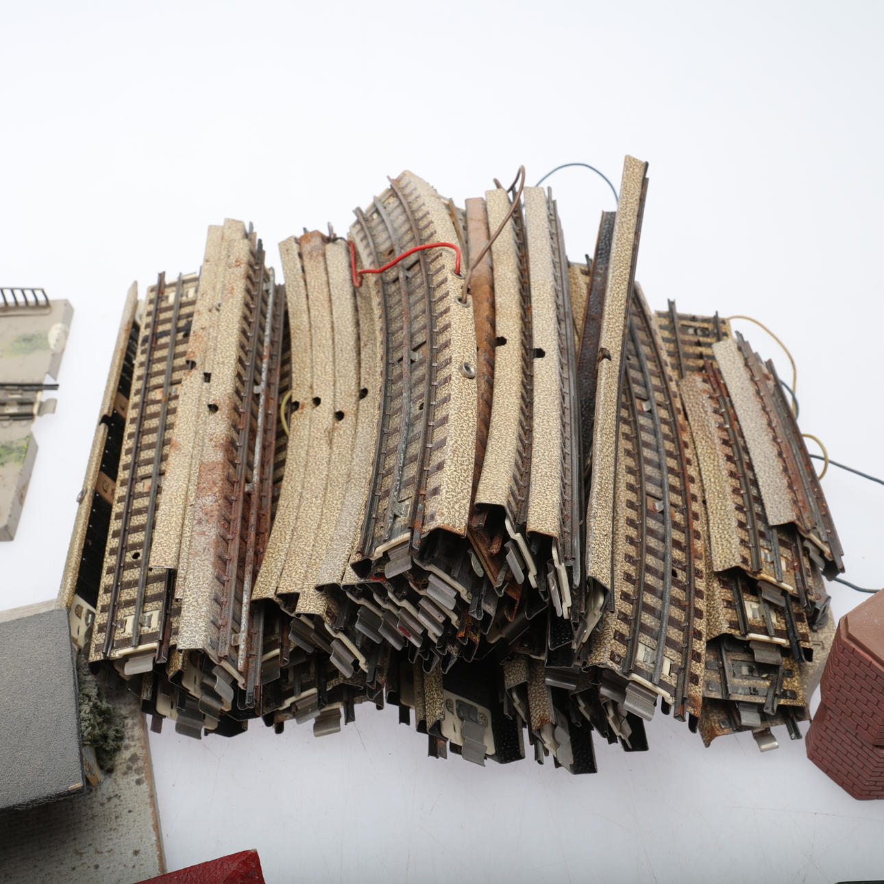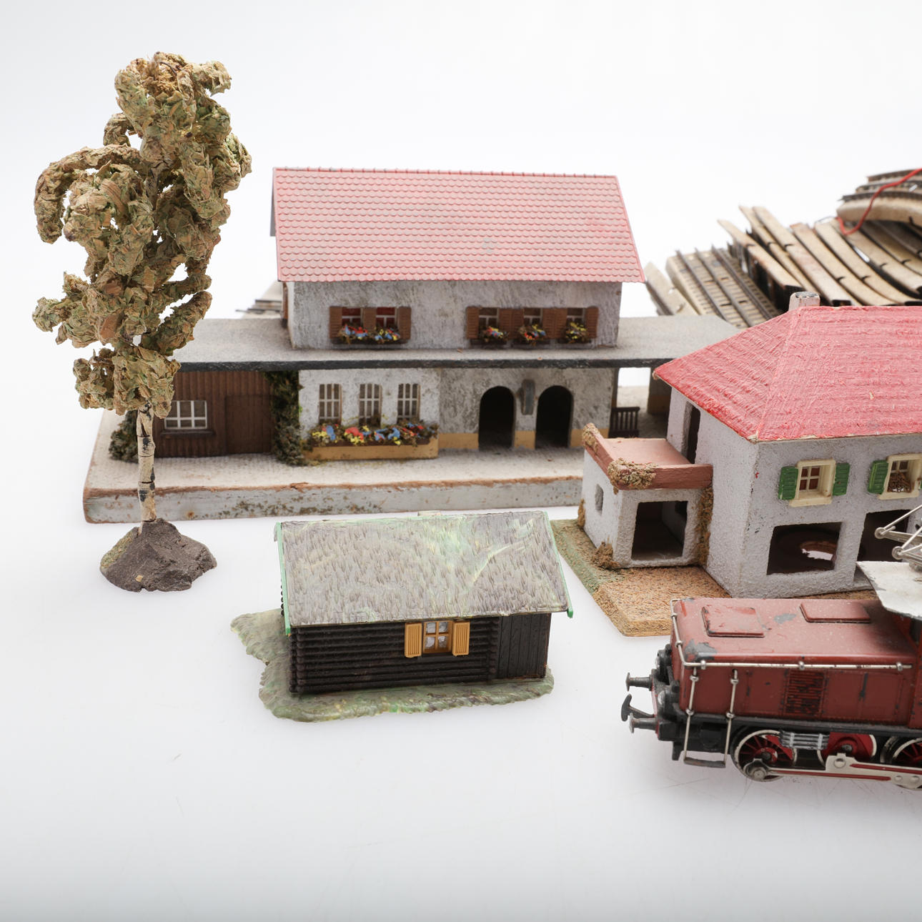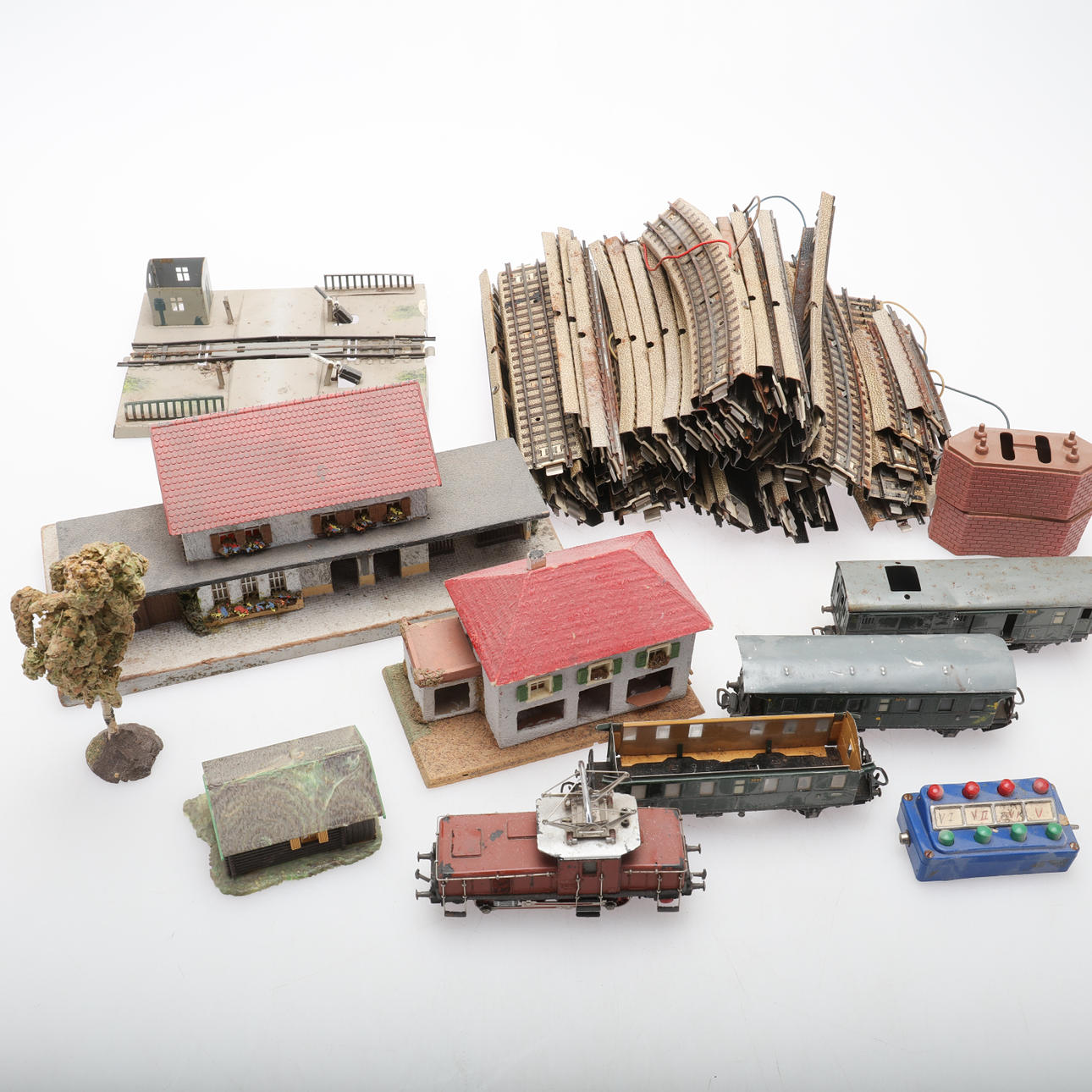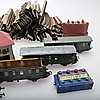 Div rälsdelar, 1 lok, 3 vagnar, några hus.