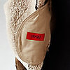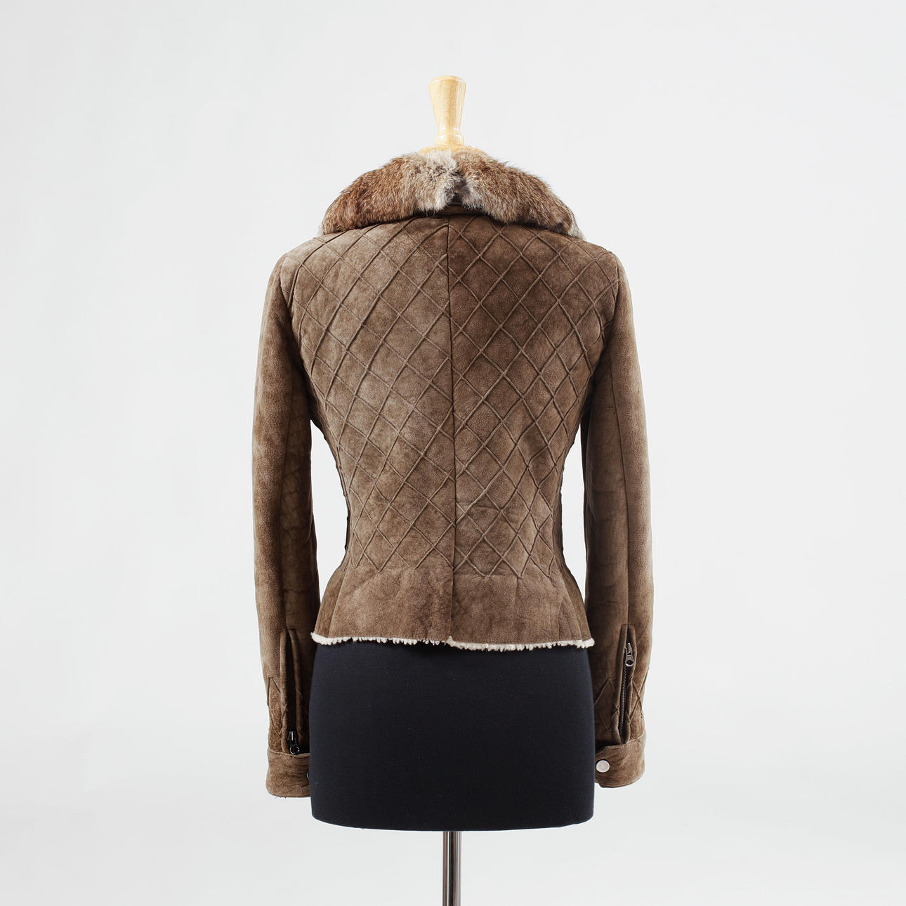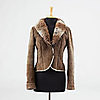 Damjacka i grönbrun, ofodrad, i mocka (lammpäls) med rutig mönster. Avtagbar krage i kaninpäls. 2 dragkedjor i ärmarna och tryckknapp, 3 fickor varav en inneficka . Storlek small.