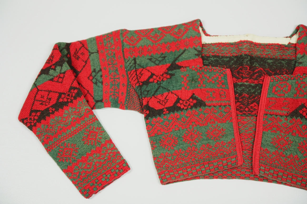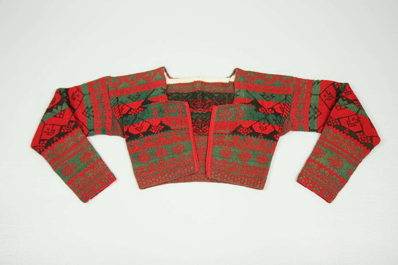 Bröstmått 88 cm, längd från axel 33 cm, ärmlängd 48 cm, överärmsvidd 32 cm. yllegarn.