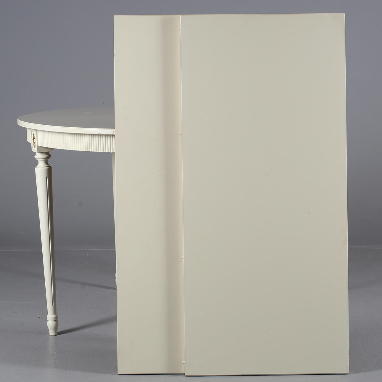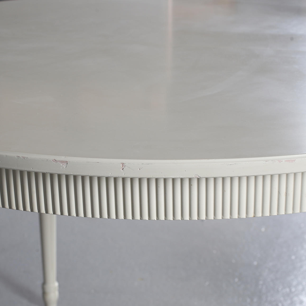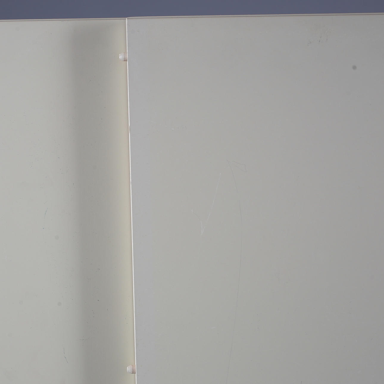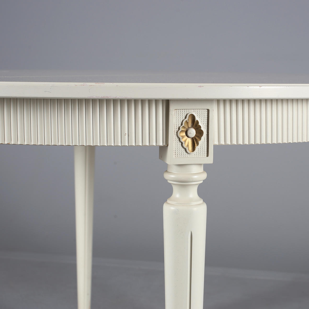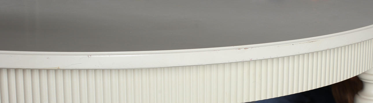 Bruksslitage, kantstött, färgsläpp, sprickor, en iläggsskiva med repor.