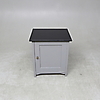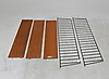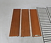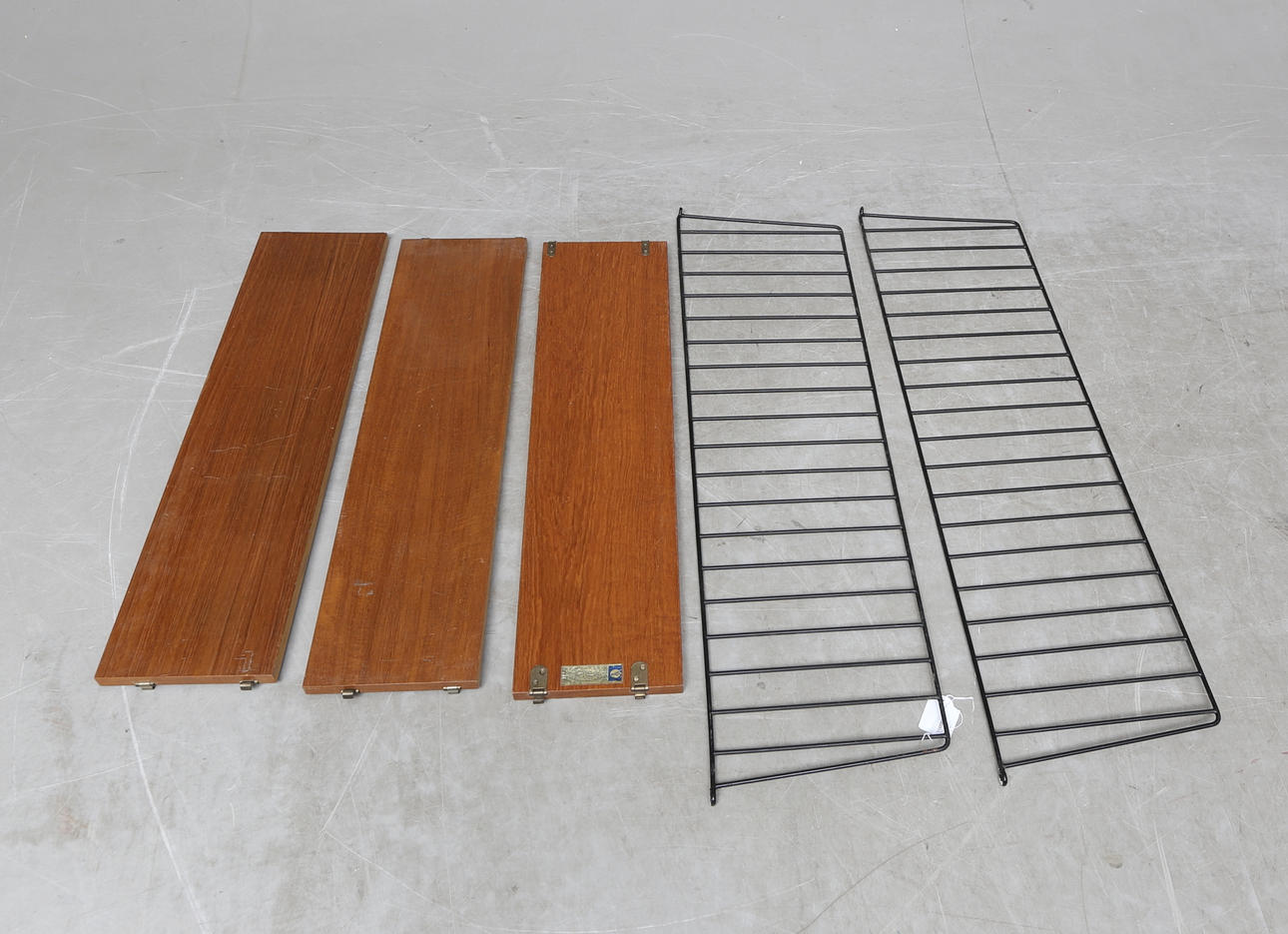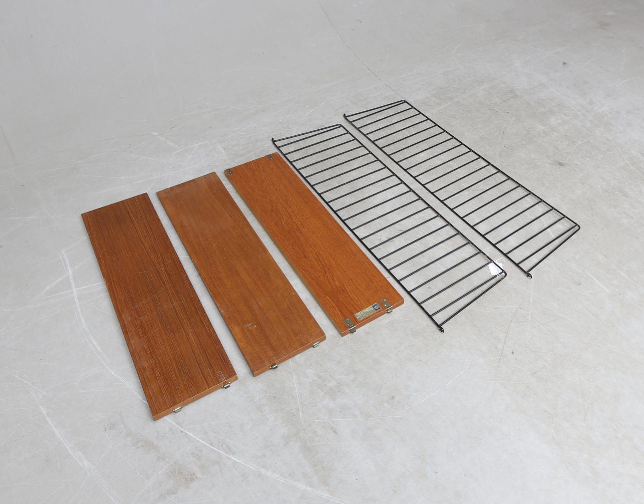 Hyllplan fanerade i teak, märkta med etikett, längd ca. 78, bredd 20 cm. Gavlar, 2 st, höjd ca. 101 cm.