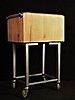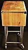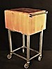 Kubbe i trä, stålunderrede med hjul. Höjd 85 cm, enbart träkubb 30 cm, längd 53 cm, bredd 40 cm.