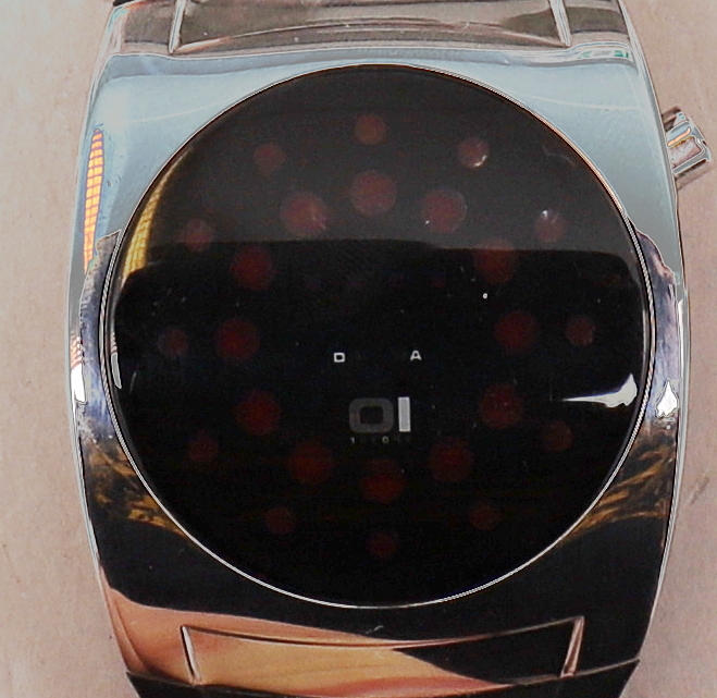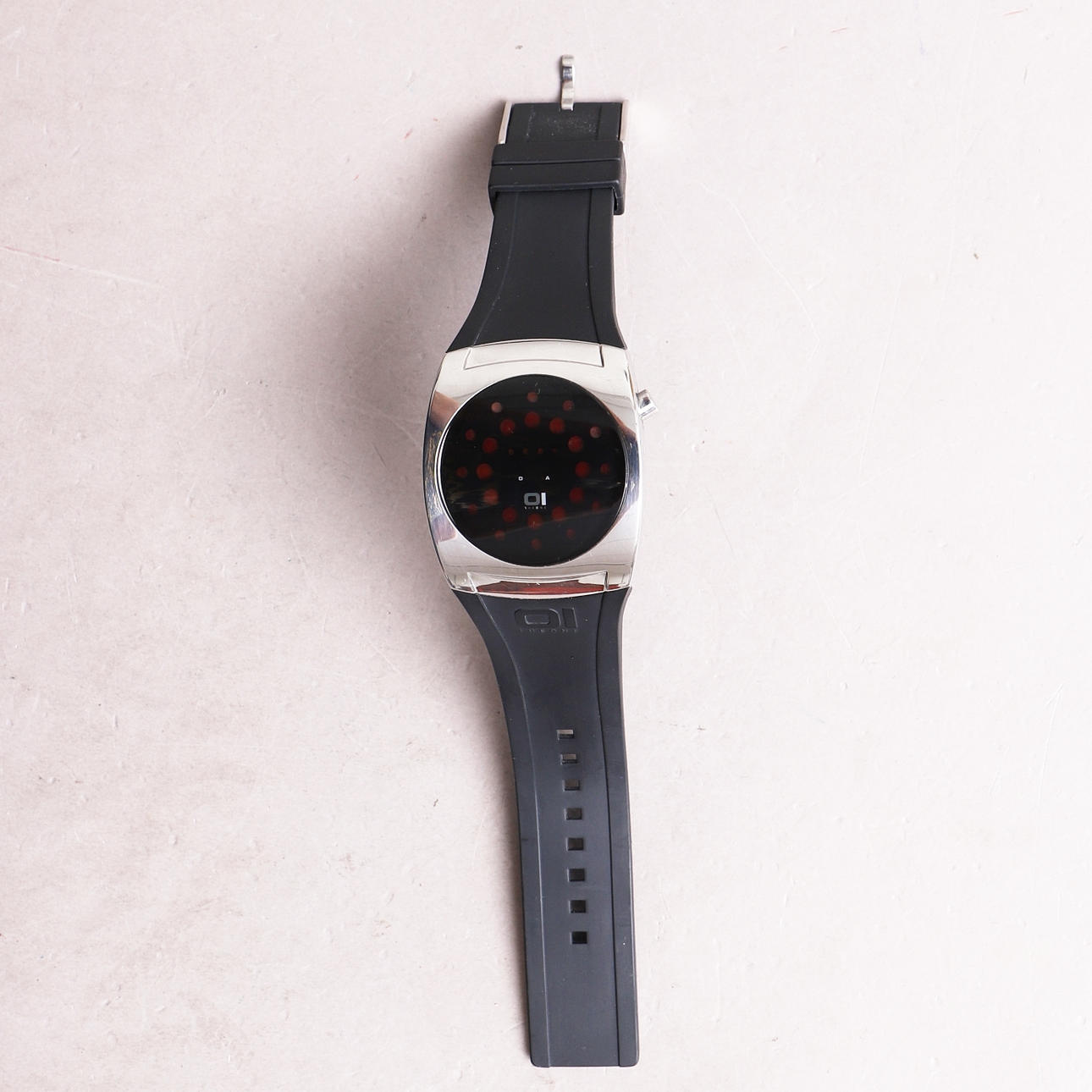 Svart plastarmband, original. Binary time. Tid visas genom upplysta röda ljuspunkter.